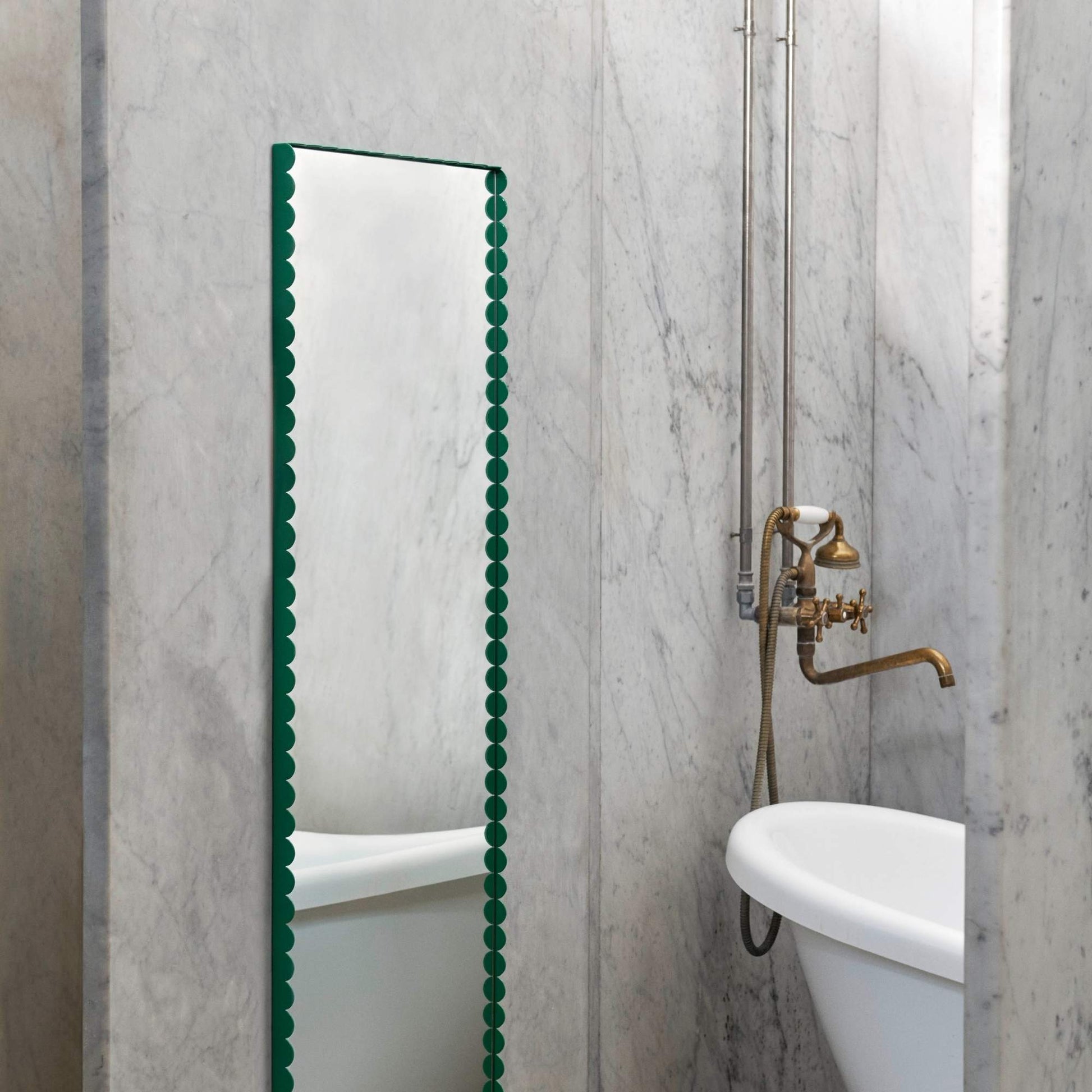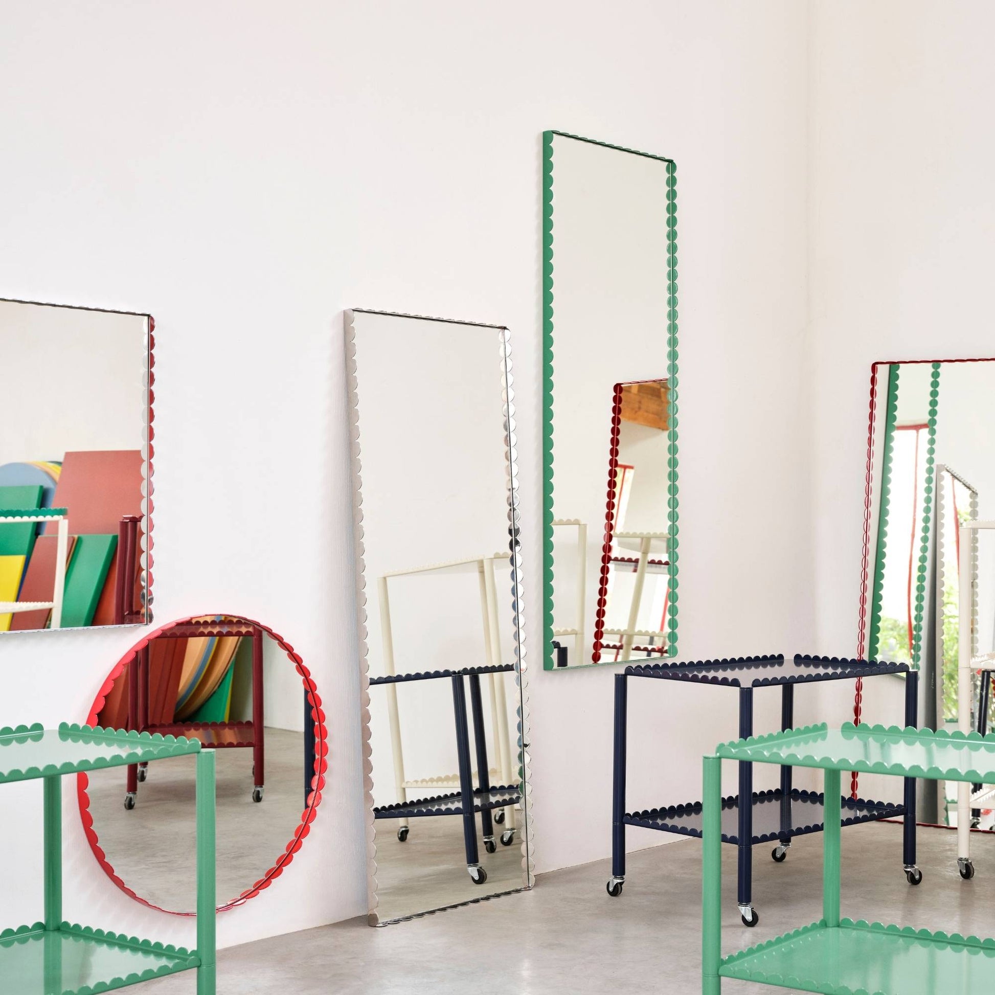 Designed by Belgian duo Muller Van Severen, Arcs Mirror is formed by a unified chain of vertical arcs that encase the mirror to create an elegant, scalloped edge. Made in stainless steel with a mirrored finish and powder coated steel in different colours, its variety of sizes and shapes ranges from a small round mirror to a large rectangular one, making it suitable for all rooms and uses.