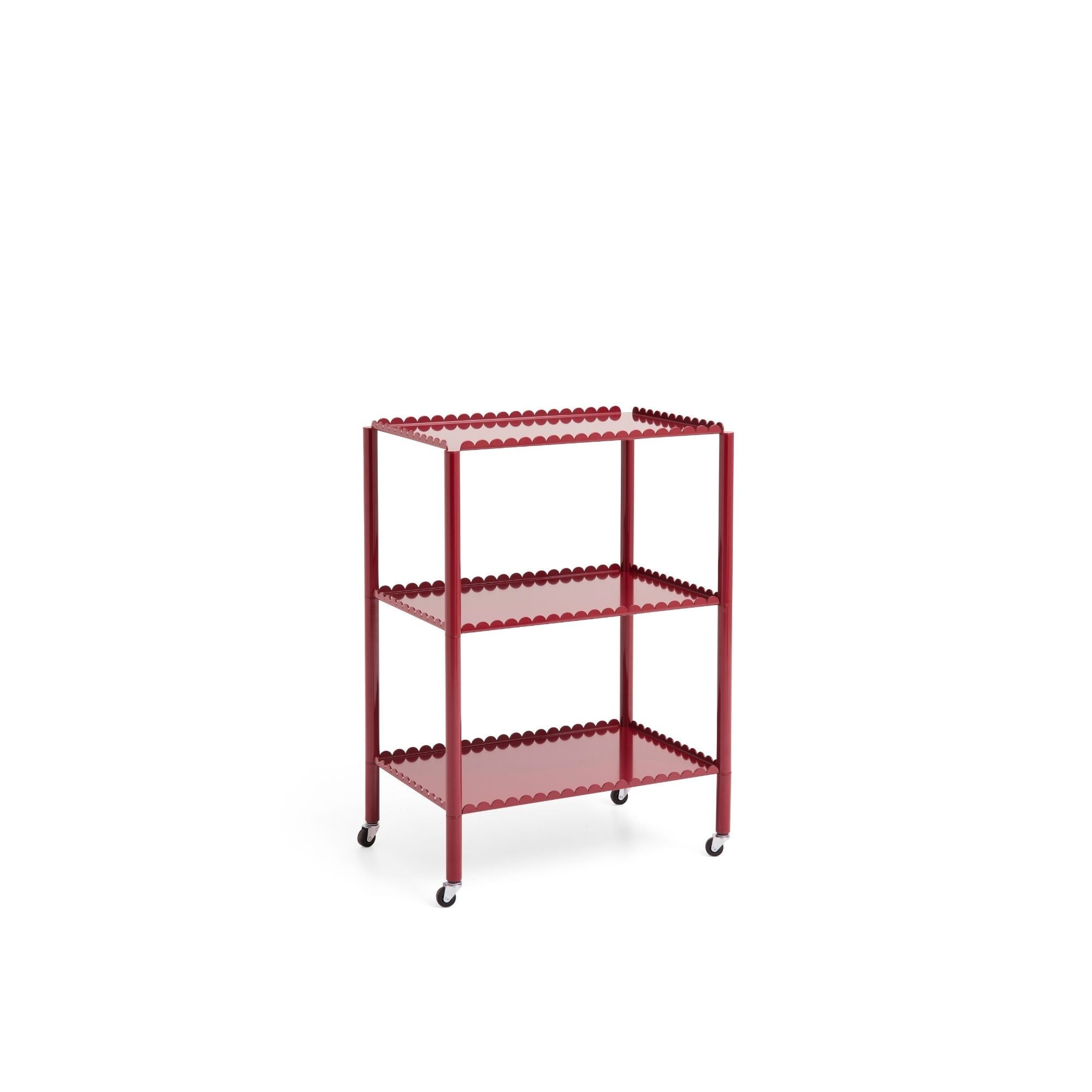 Designed by Belgian duo Muller Van Severen, Arcs Trolley is a functional and decorative trolley encased in a unified chain of vertical arcs. A small piece of furniture with a strong presence, the trolley combines industrial techniques with poetic lines to create a distinctive and sculptural expression. The elegant, scalloped frame supports two or three tiers, with slim legs mounted on castors for easy manoeuvring. Made in powder coated steel in different colour options, the trolley is suitable for most rooms and uses in the home, from displaying and storing items in the living room to extra shelving in the kitchen or as a bedside cabinet.