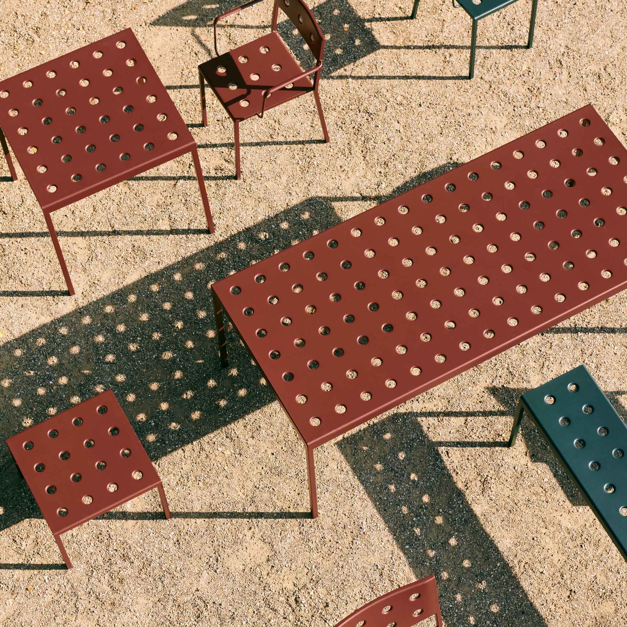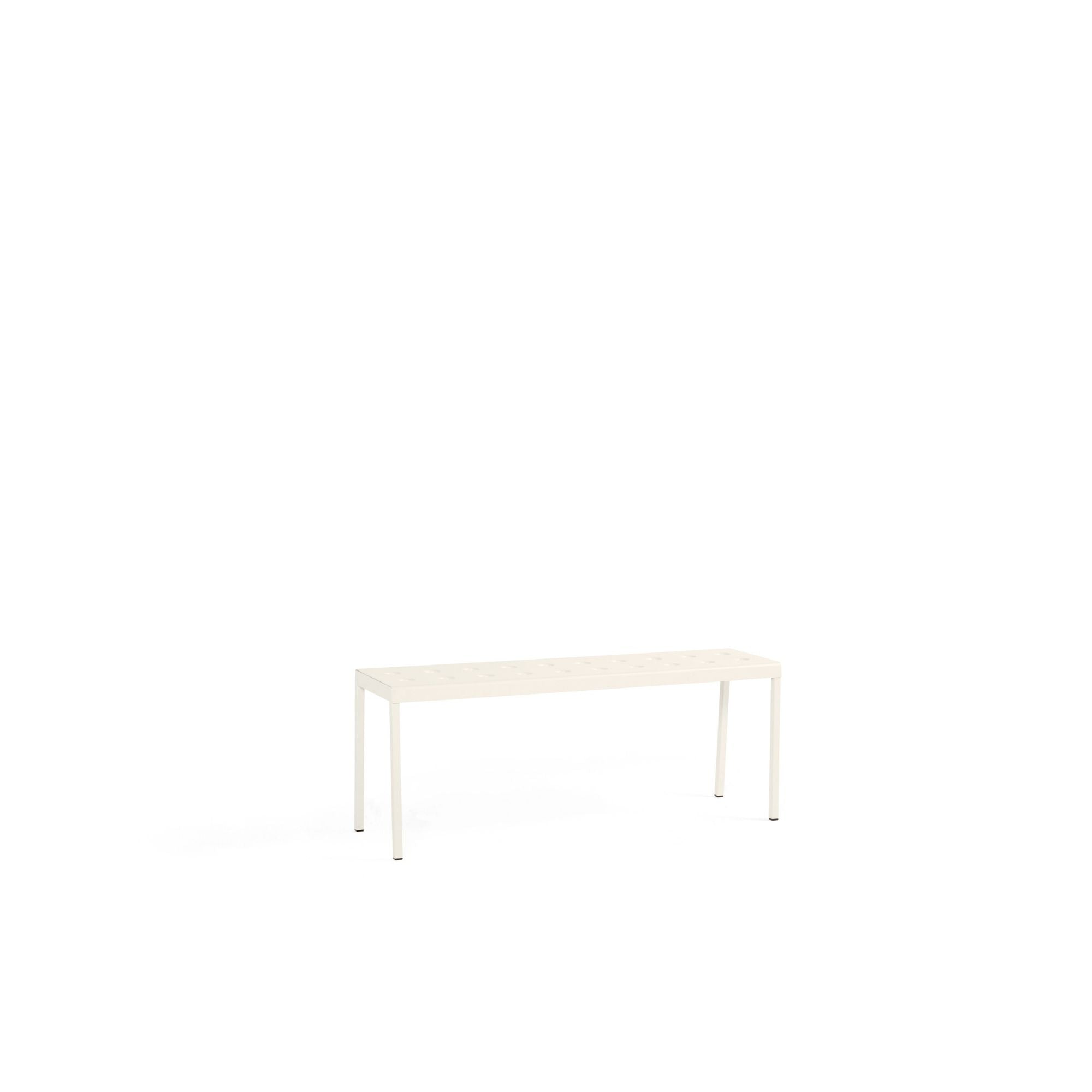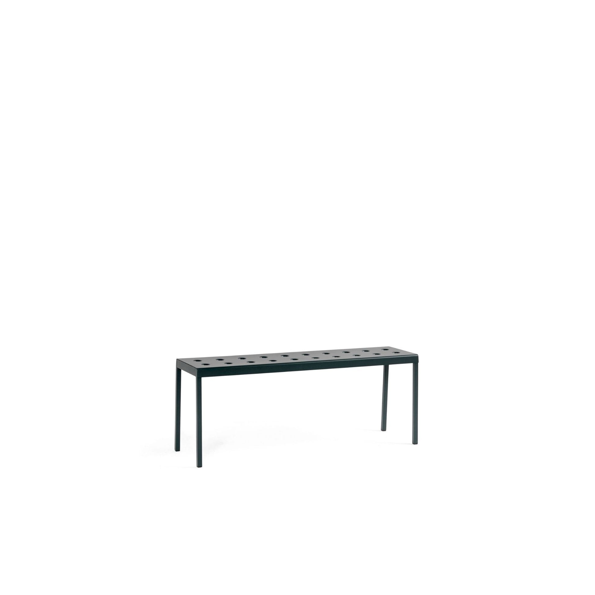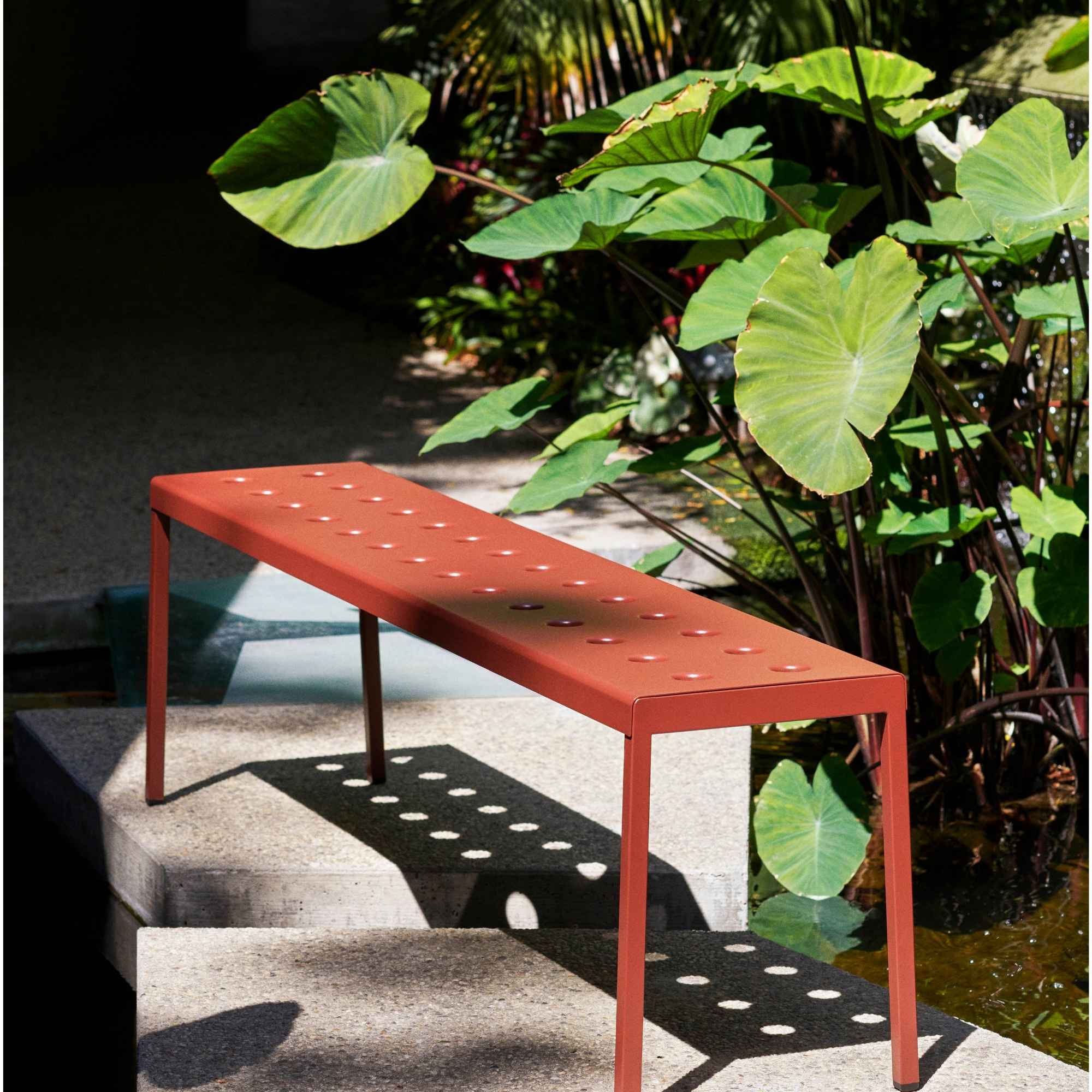 The Balcony Bench is an elegant seating solution from HAY's Balcony outdoor collection. The simple rectangular design is softened by the slender legs, with the multiple holes in the seat strengthening the construction, as well as creating a distinct expression. It is made in powder-coated steel with an outdoor primer for optimal resilience and durability.