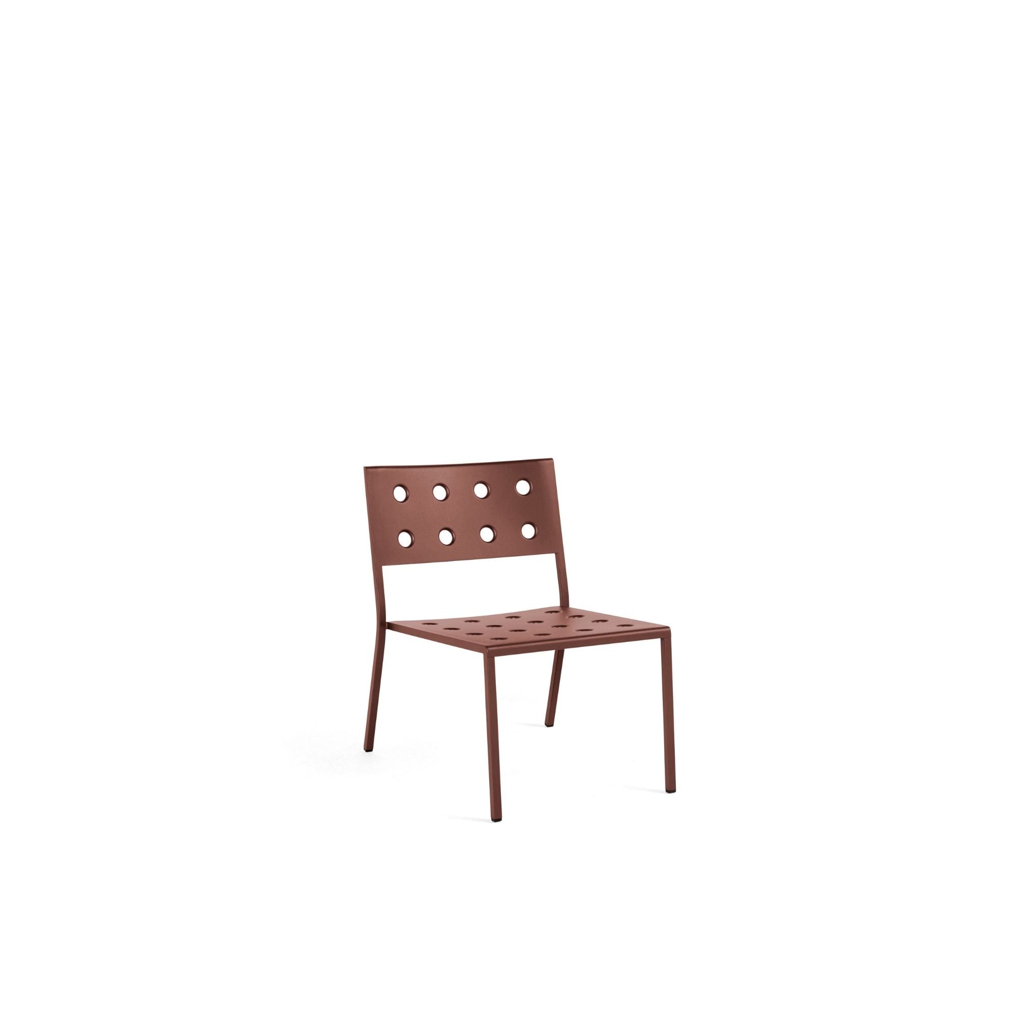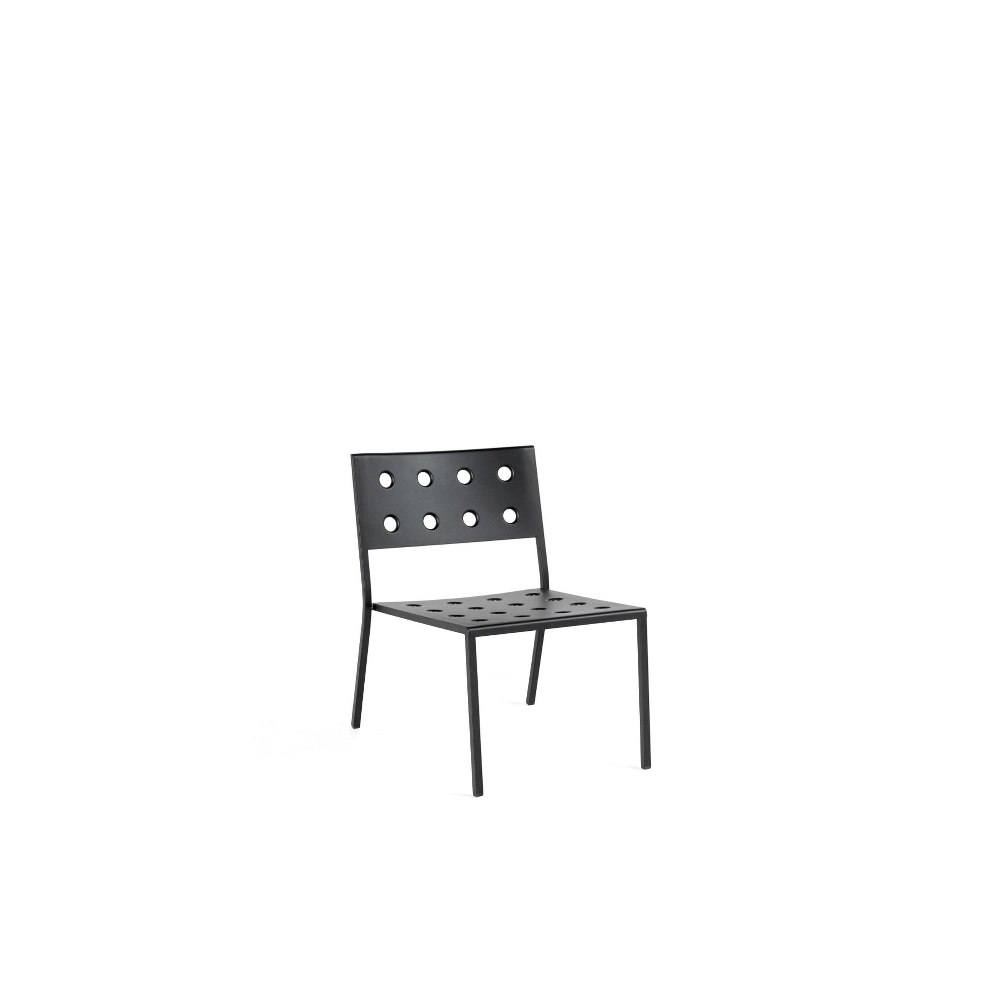 The Balcony Lounge Chair is a low and comfortable lounge chair from HAY's Balcony's outdoor collection. The wide, square design is softened by the rounded back, with the multiple holes in the seat and back strengthening the construction, as well as creating a distinct expression. It is made in powder-coated steel with an outdoor primer for optimal resilience and durability.