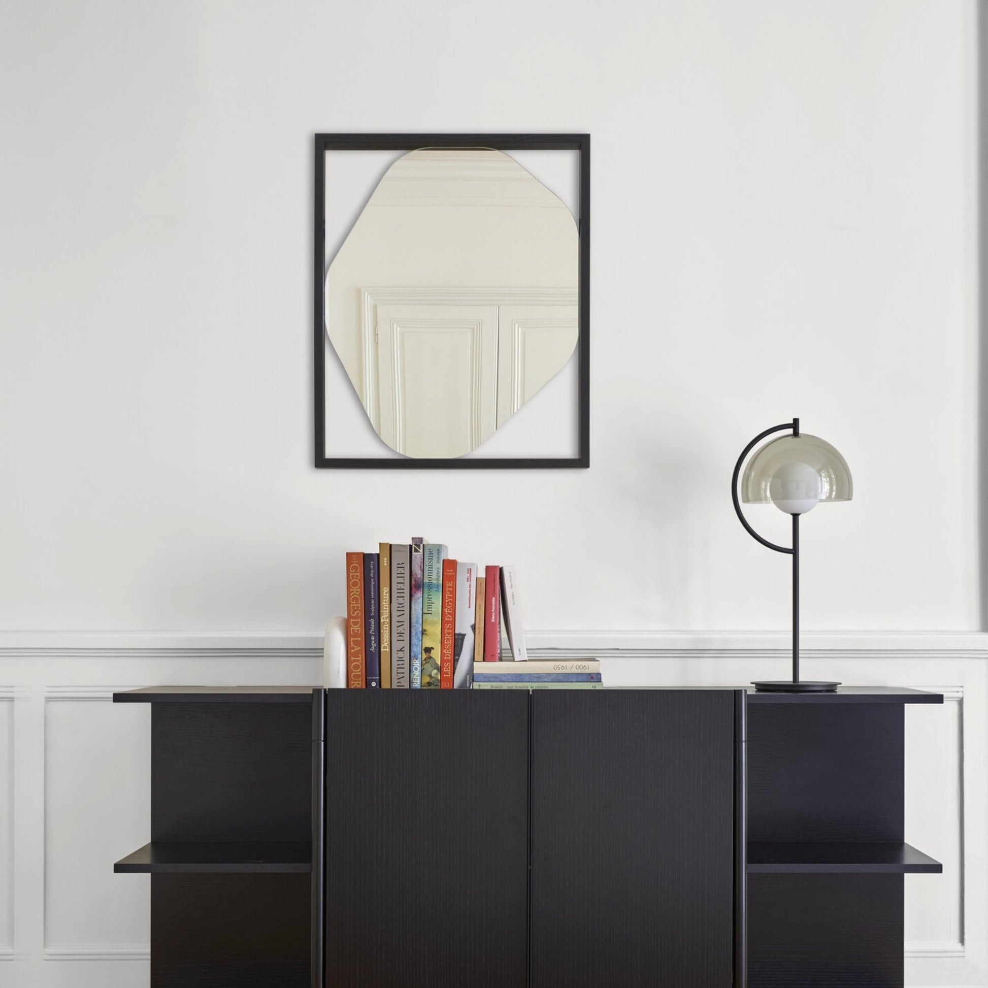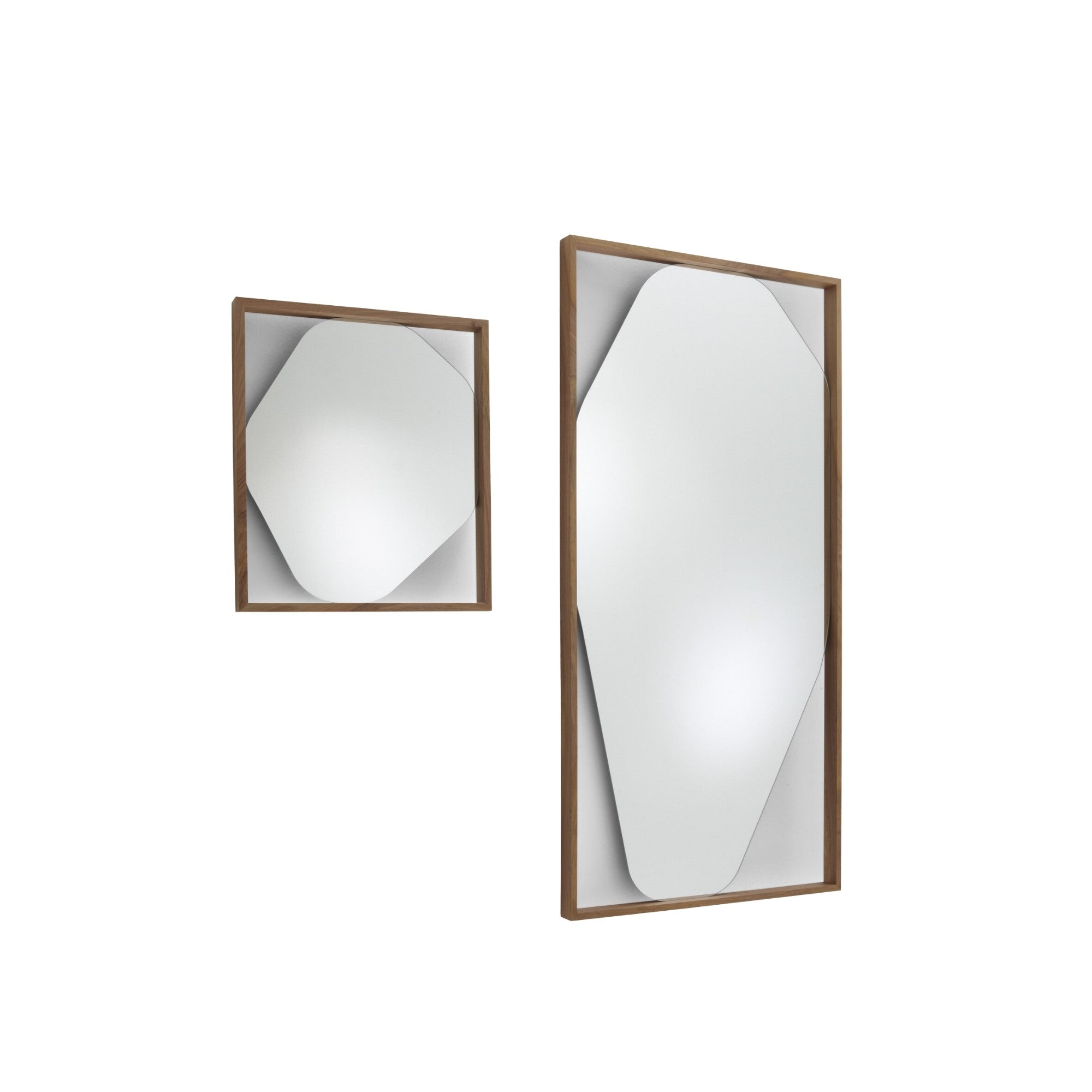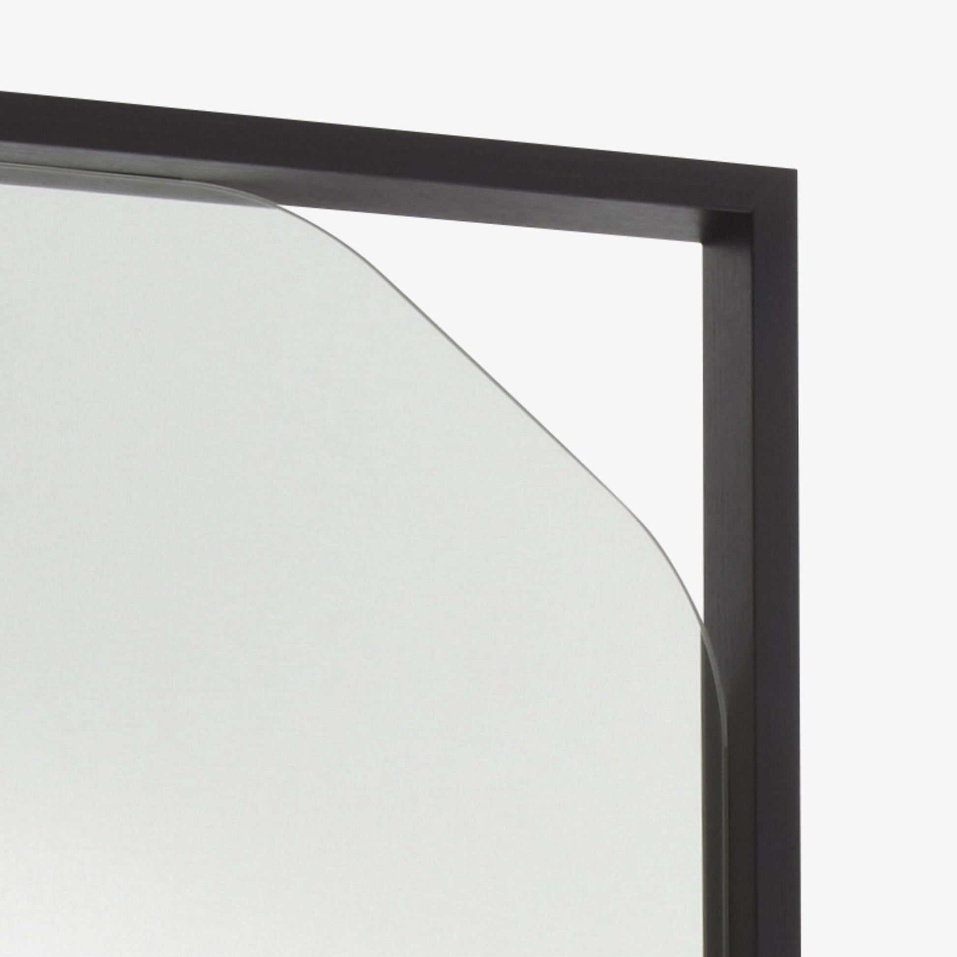 Frame made from American solid walnut or black-stained solid Ash, the mirror glass is fixed to an MDF support with 2 struts which enables the mirror to be fixed to the wall either horizontally or vertically.