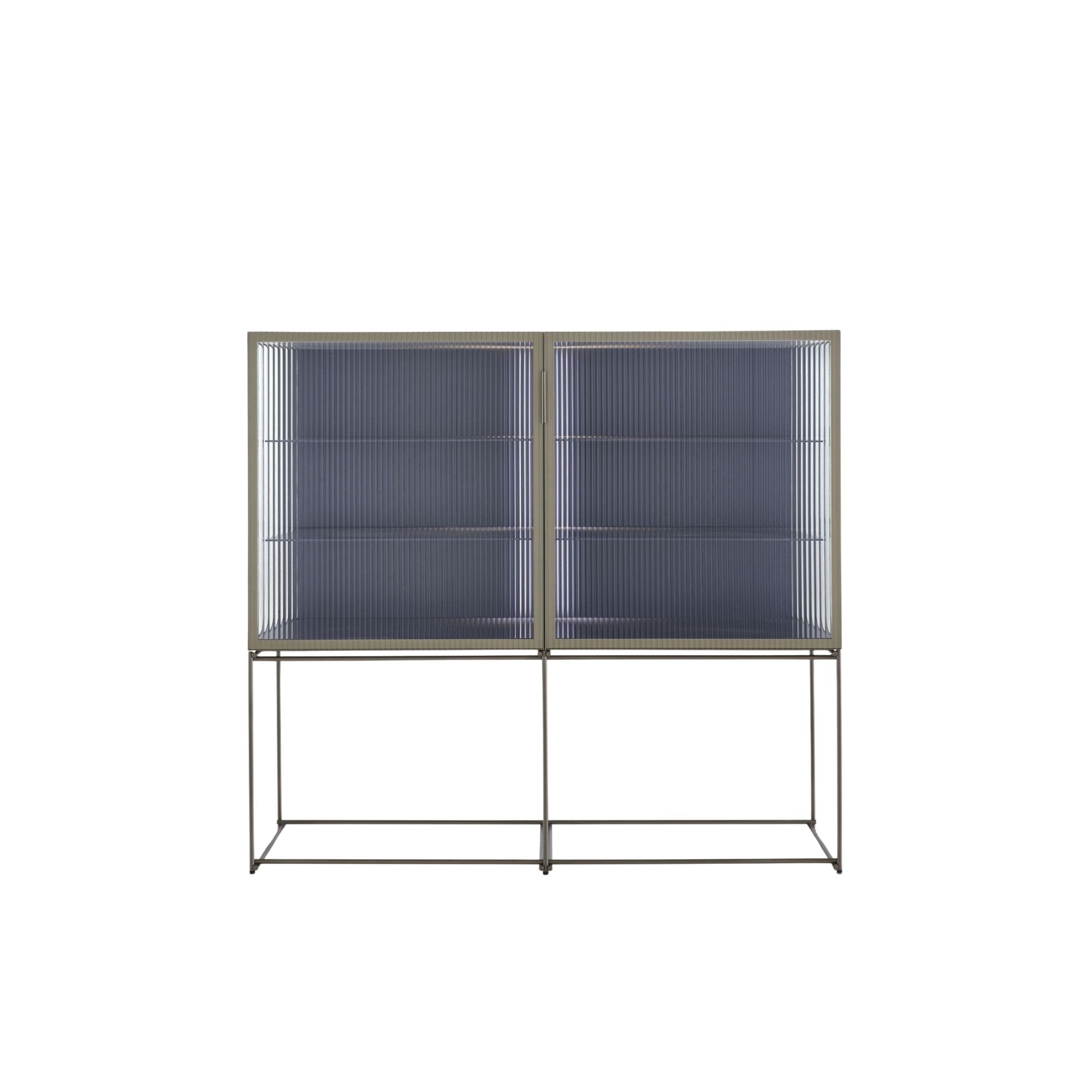 A display cabinet with glazed panels that reveal and obscure the contents, making it a gallery and storage unit all at once. The fluted glass plays with light while the slender legs bring visual lightness. This Mauro Lipparini-designed piece is sure to bestow character to any room.