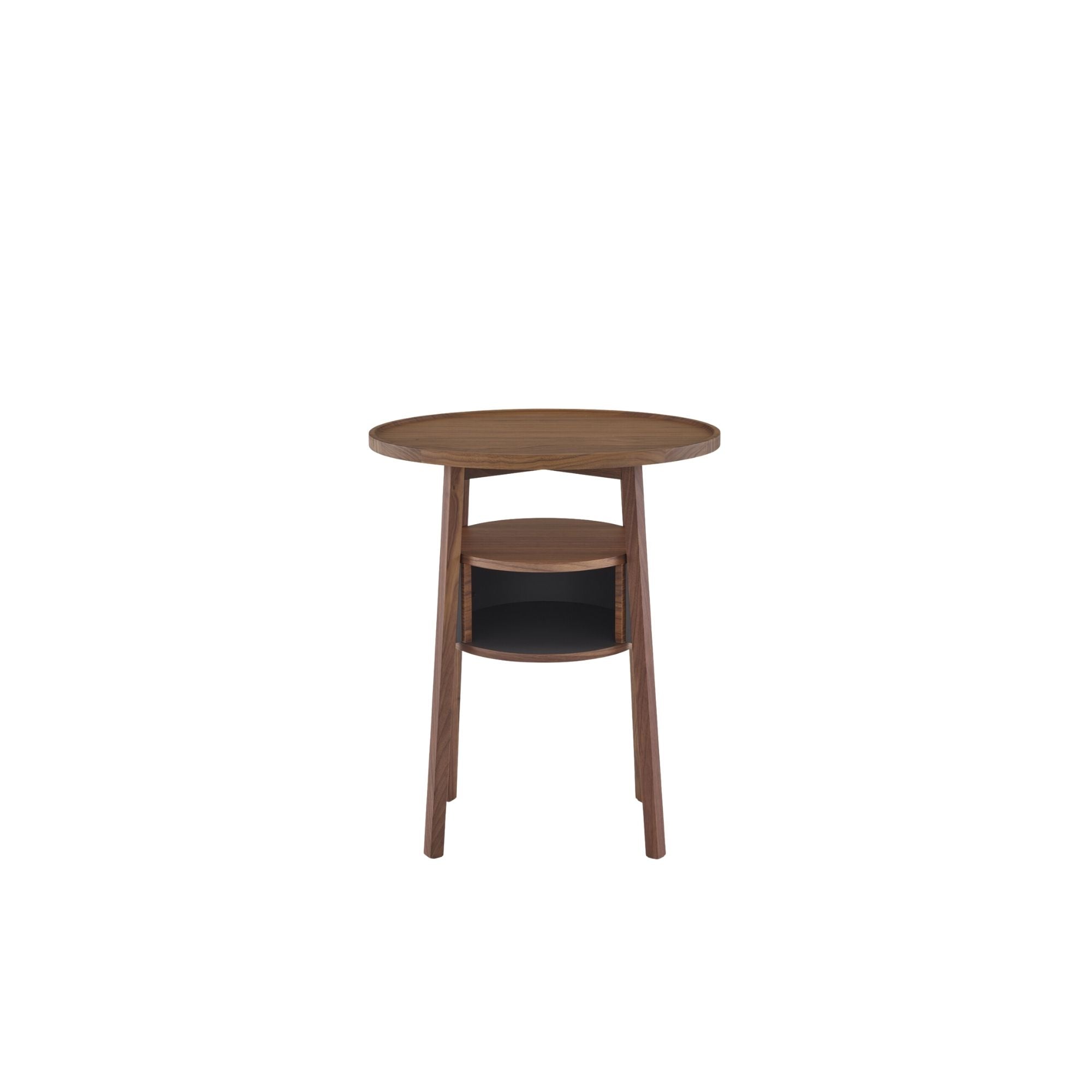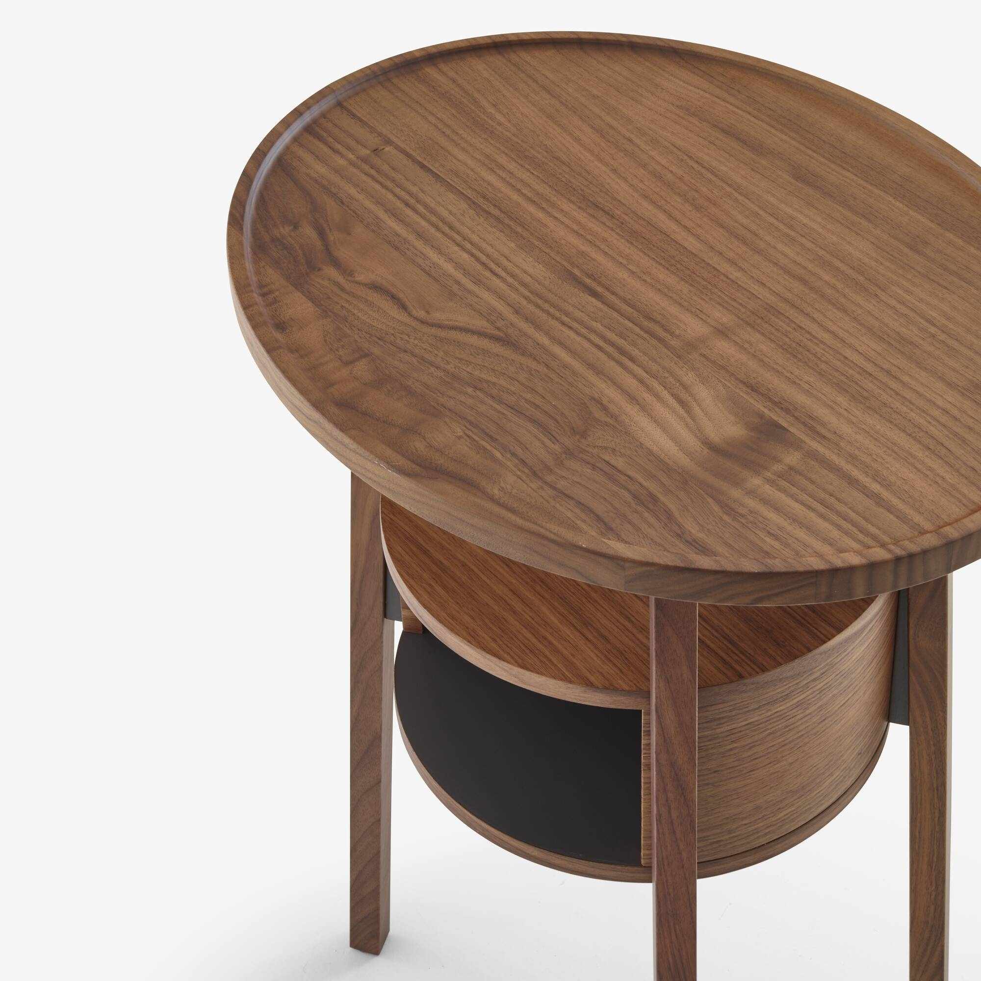 By night, this oval-topped walnut bedside table is a real piece of craftsmanship, with the possibility of placing objects at a range of different levels. By day, it will also find a useful place in the home.