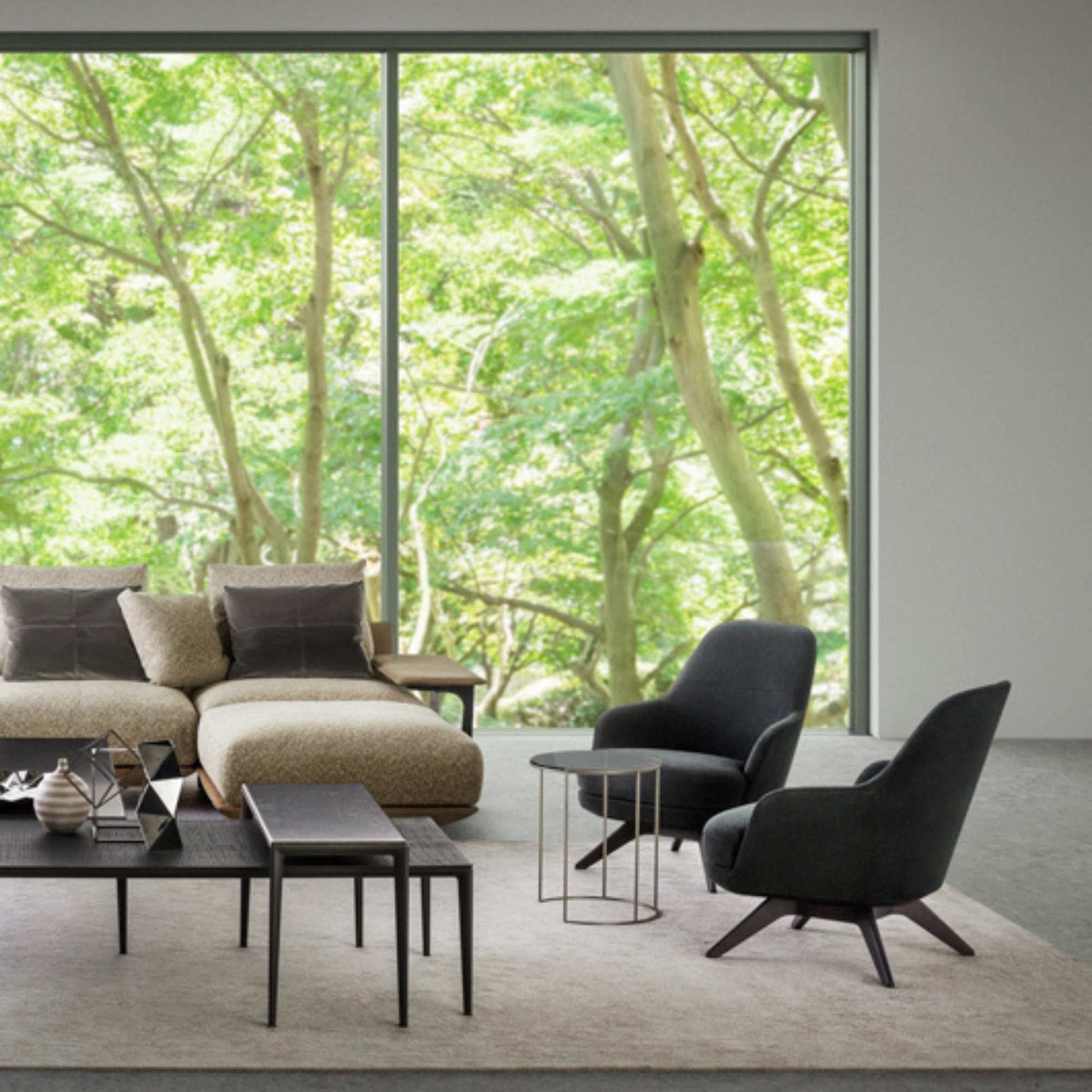 Swivelling personal sofa that adds a contemporary levity to a classical design. The backrest extends to your shoulders, yet the overall form is nicely compact. An optional feature automatically returns the seat to its original orientation after you stand up.