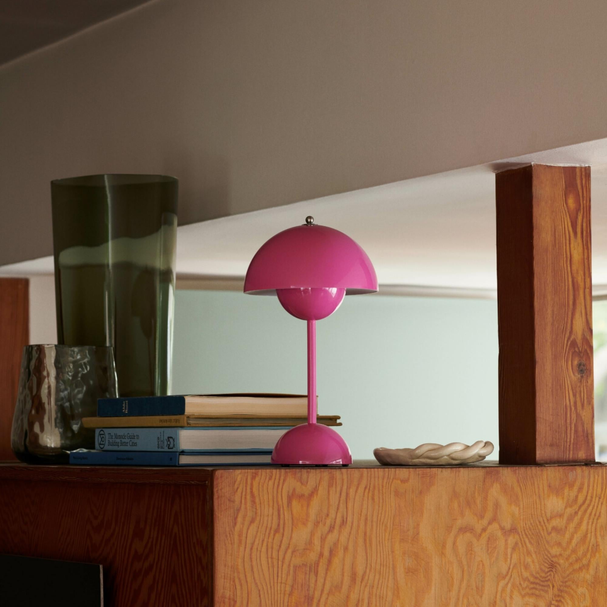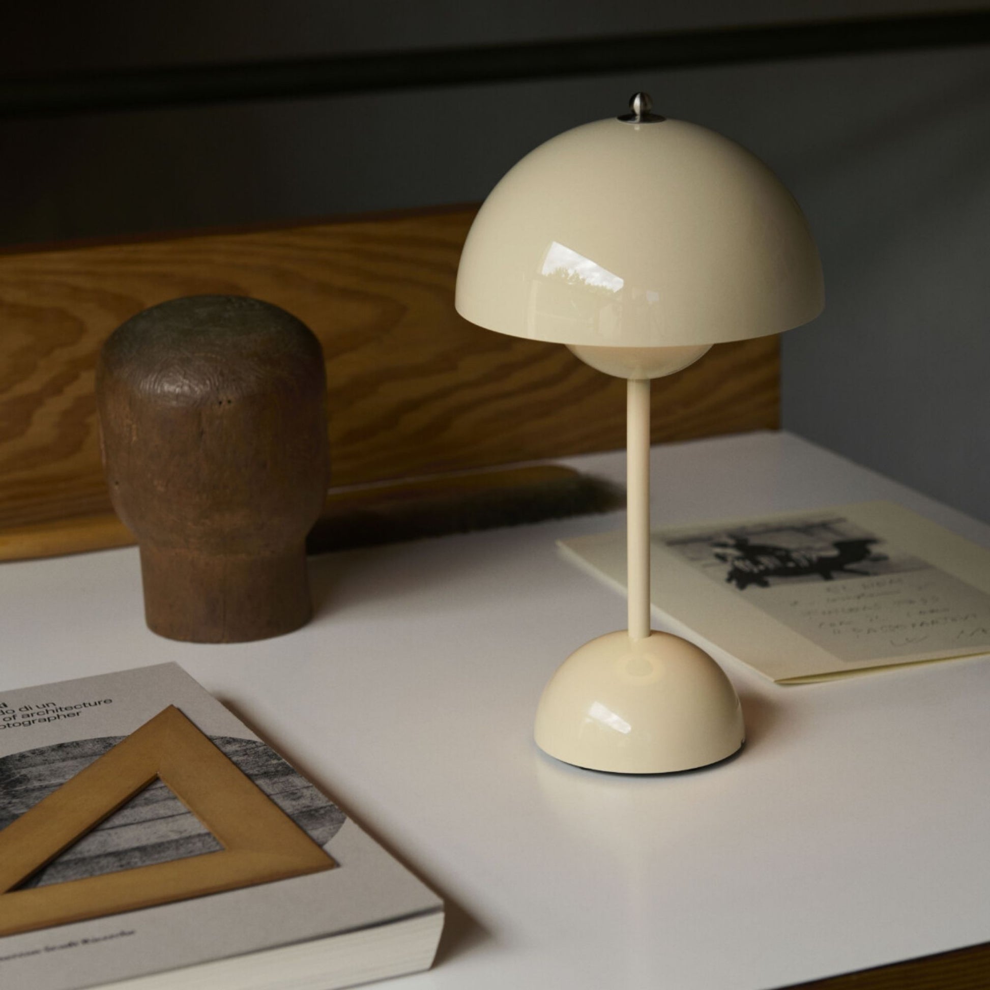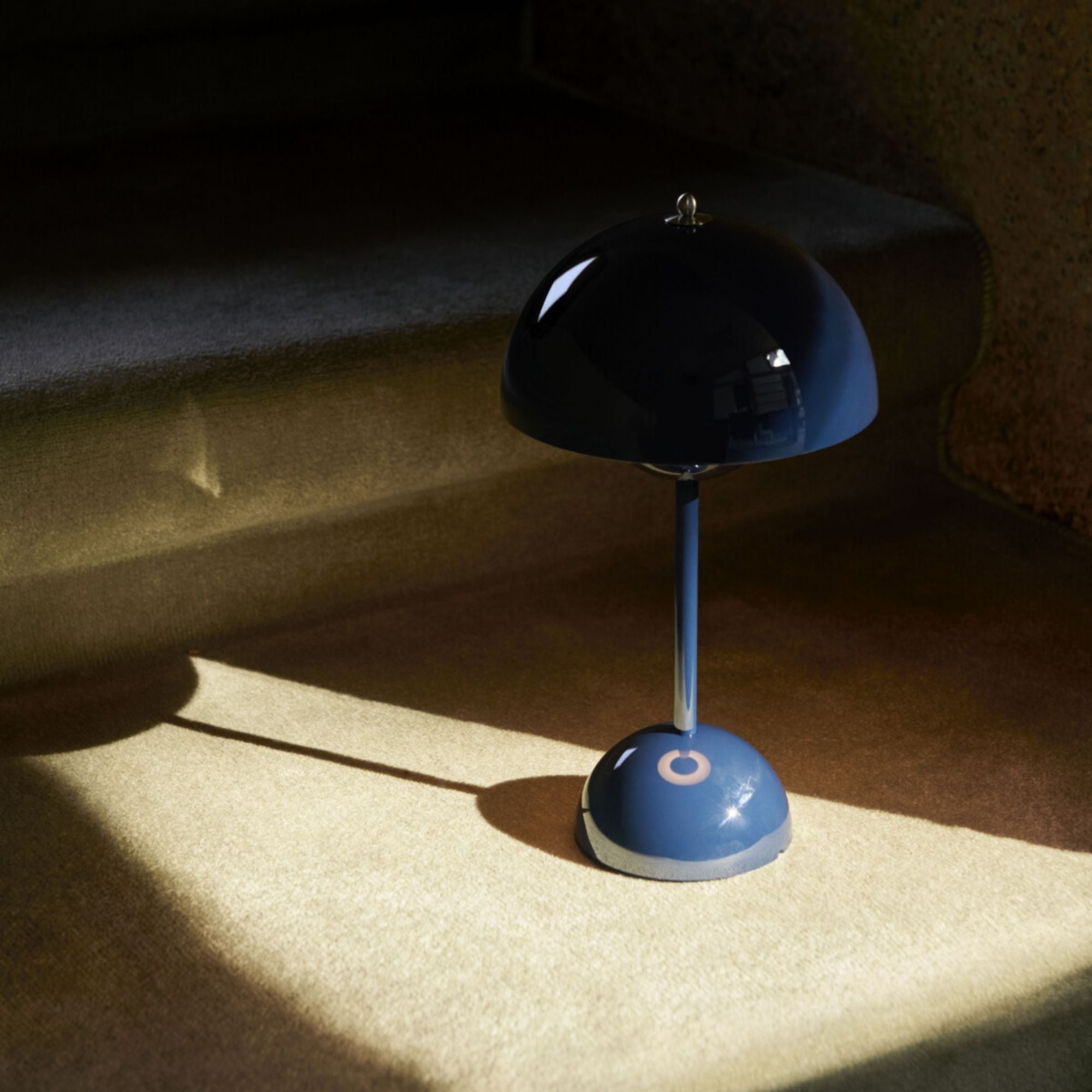 Reflecting the same iconic design as the Flowerpot table lamp, the petite proportions of the VP9 lamp have the added advantage of being mobile. The deliberately lightweight design and cordless feature allow the lamp to be easily moved from table to counter as needed.