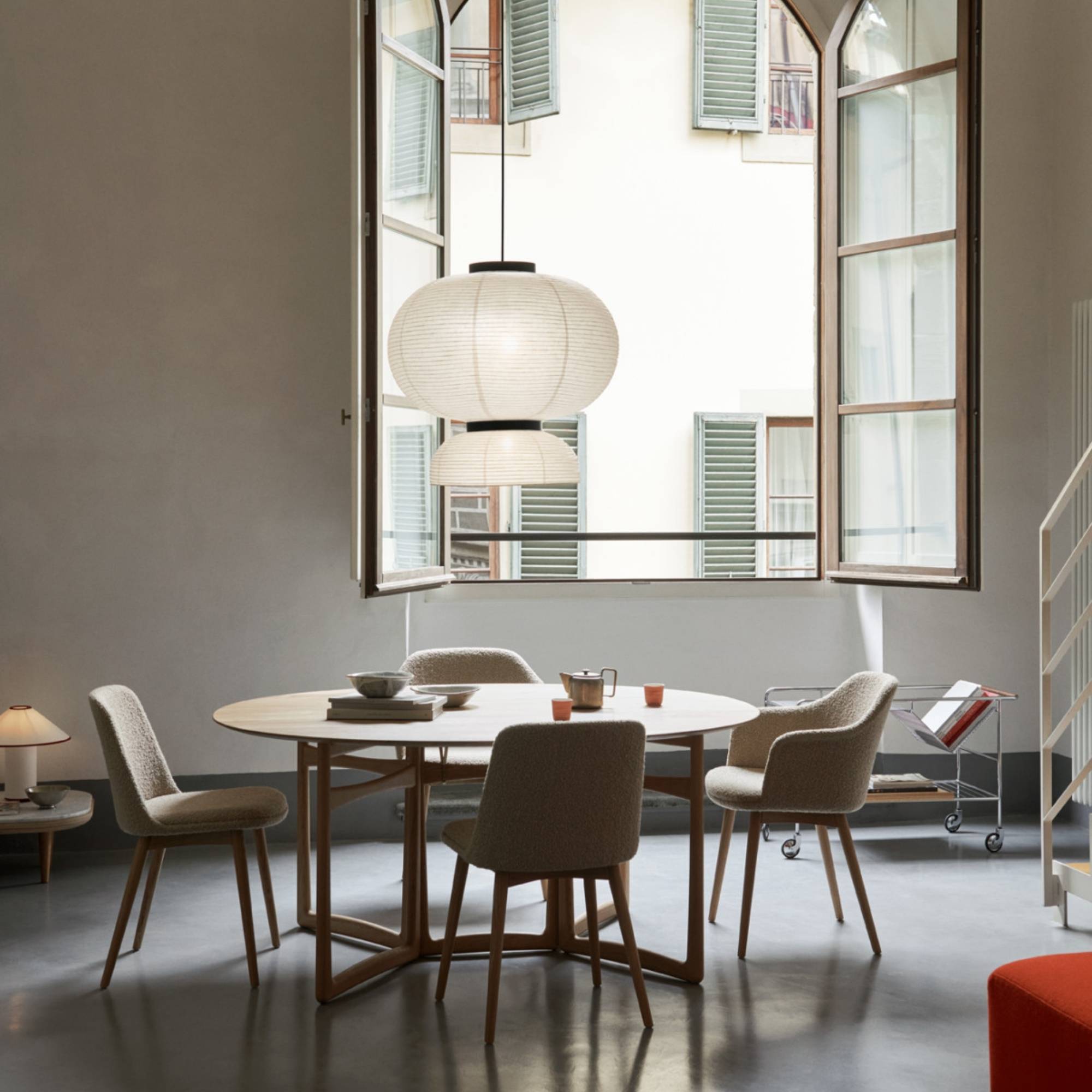 An ode to Asian design through the lens of Scandinavian minimalism, the beauty of the Formakami pendants lies in their material delicacy. Designed by Jaime Hayon and handcrafted with paper – the airy, bulbous shape is accentuated by the grounding presence of black stained oak – a striking visual composition reflected throughout the series.