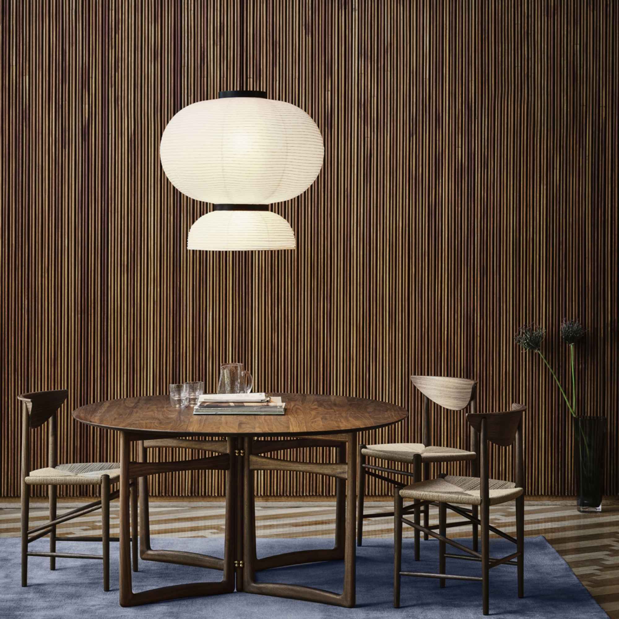 Formakami pendants captivate with their delicate, handcrafted paper forms. The airy, bulbous shapes are grounded by black-stained oak, creating a striking visual balance. Pendant is available in other shapes and sizes — JH3 & JH4.