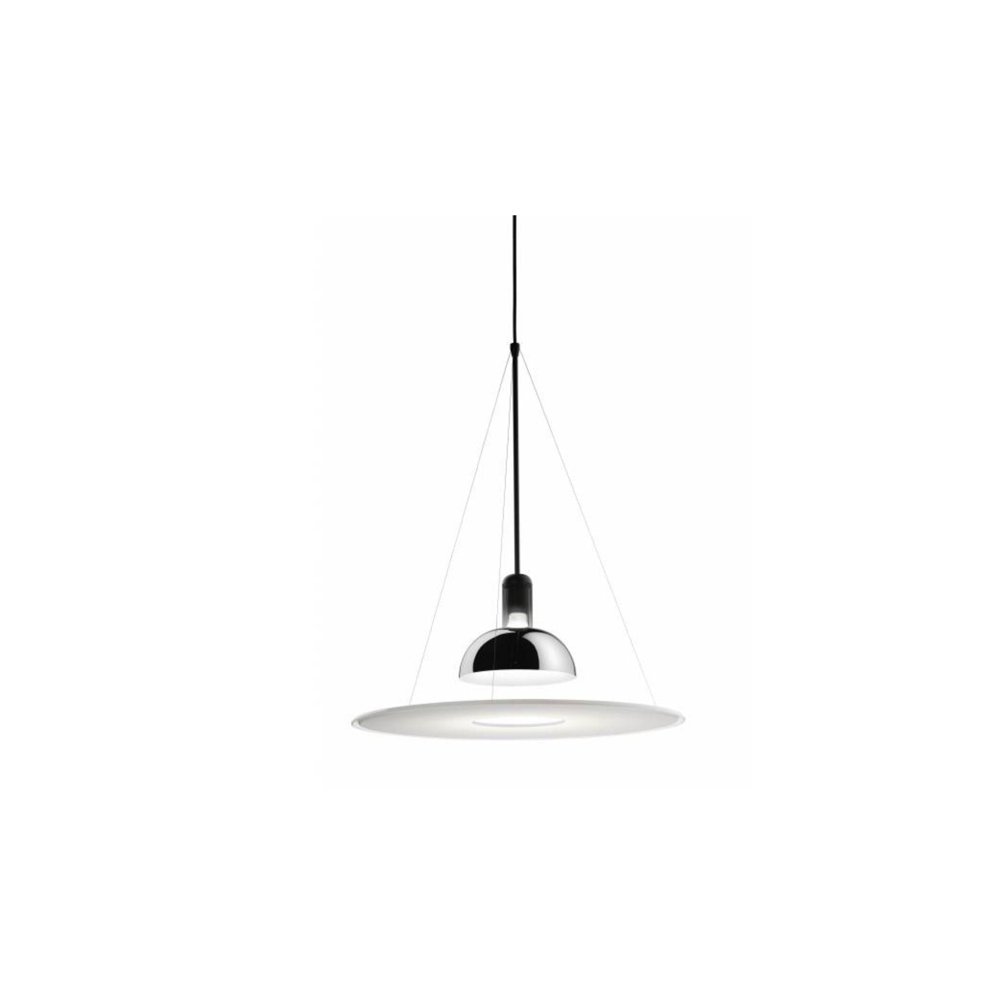 Designed by Achille Castiglioni in 1978, the FLOS Frisbi Pendant is a suspension lamp that delivers direct, diffused, and reflected light, making it perfect for modern interiors. Its opaline polymethylmethacrylate (PMMA) diffuser plate is precision-molded through injection and suspended by three fine steel cables, giving the lamp a light, floating presence.