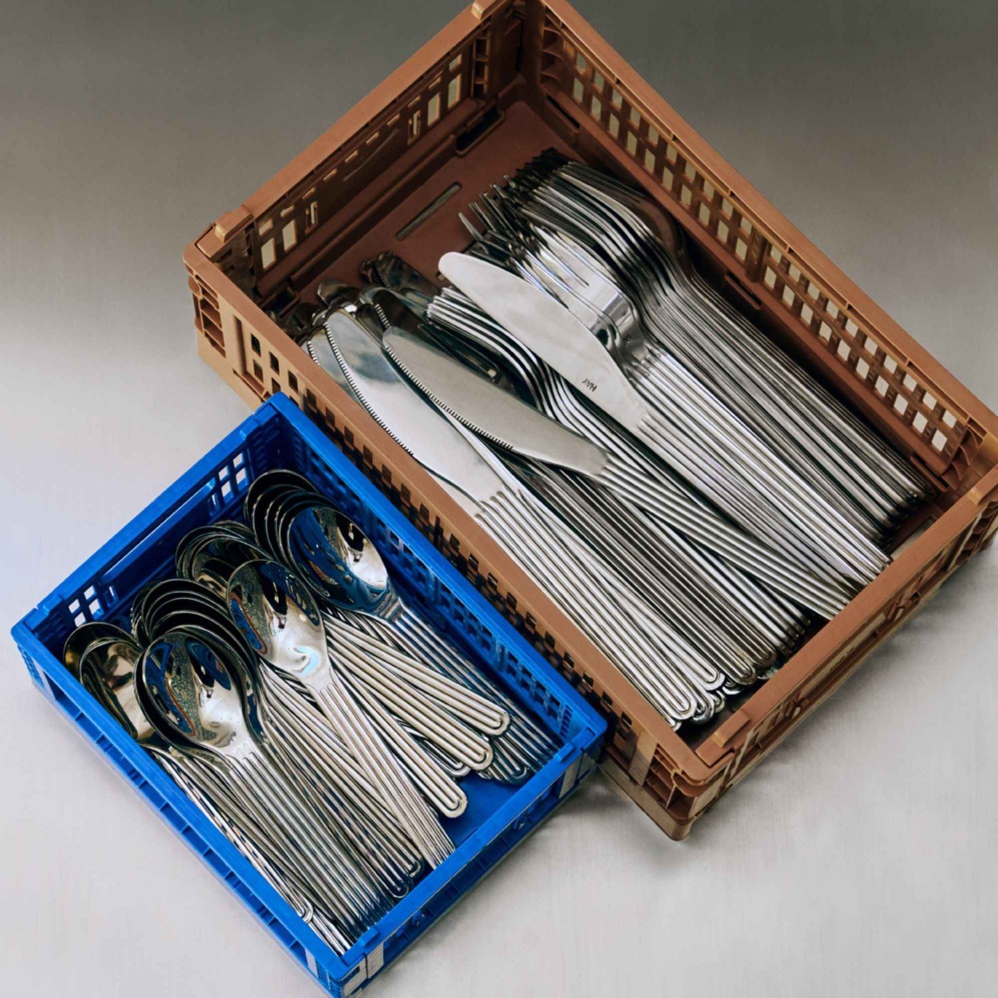 HAY’s Colour Crate is a series of handy, adaptable storage boxes with a perforated design. Made from 100% recycled post-consumer plastic, these stackable crates come in cubes, squares, and rectangles in a wide variety of colours and sizes. They can be supplemented with lids and wheels, and placed inside each other in multiple configurations, making them ideal for storage, display, and even innovative furniture items. Their multifunctionality, combined with their ability to be folded flat when not in use, makes them a versatile and space-saving storage solution.