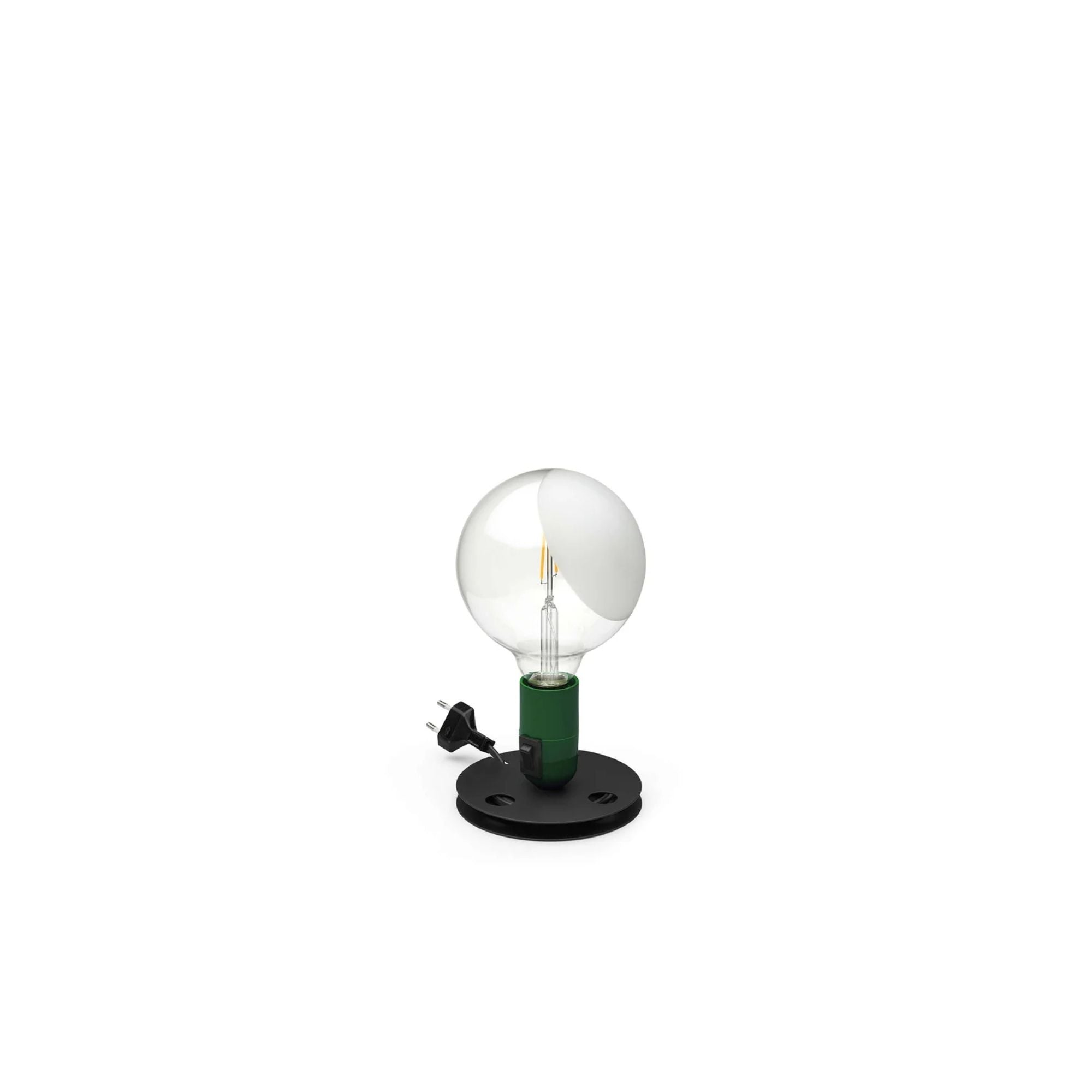The lamp features a large bulb, partially satin-finished to soften glare, mounted on a bulb holder with an integrated switch. It rests on a reel-shaped aluminum base, which conveniently allows excess cable to be rolled up and neatly stored. Lampadina combines practicality with a lighthearted, sculptural aesthetic, making it a perfect addition to modern interiors.