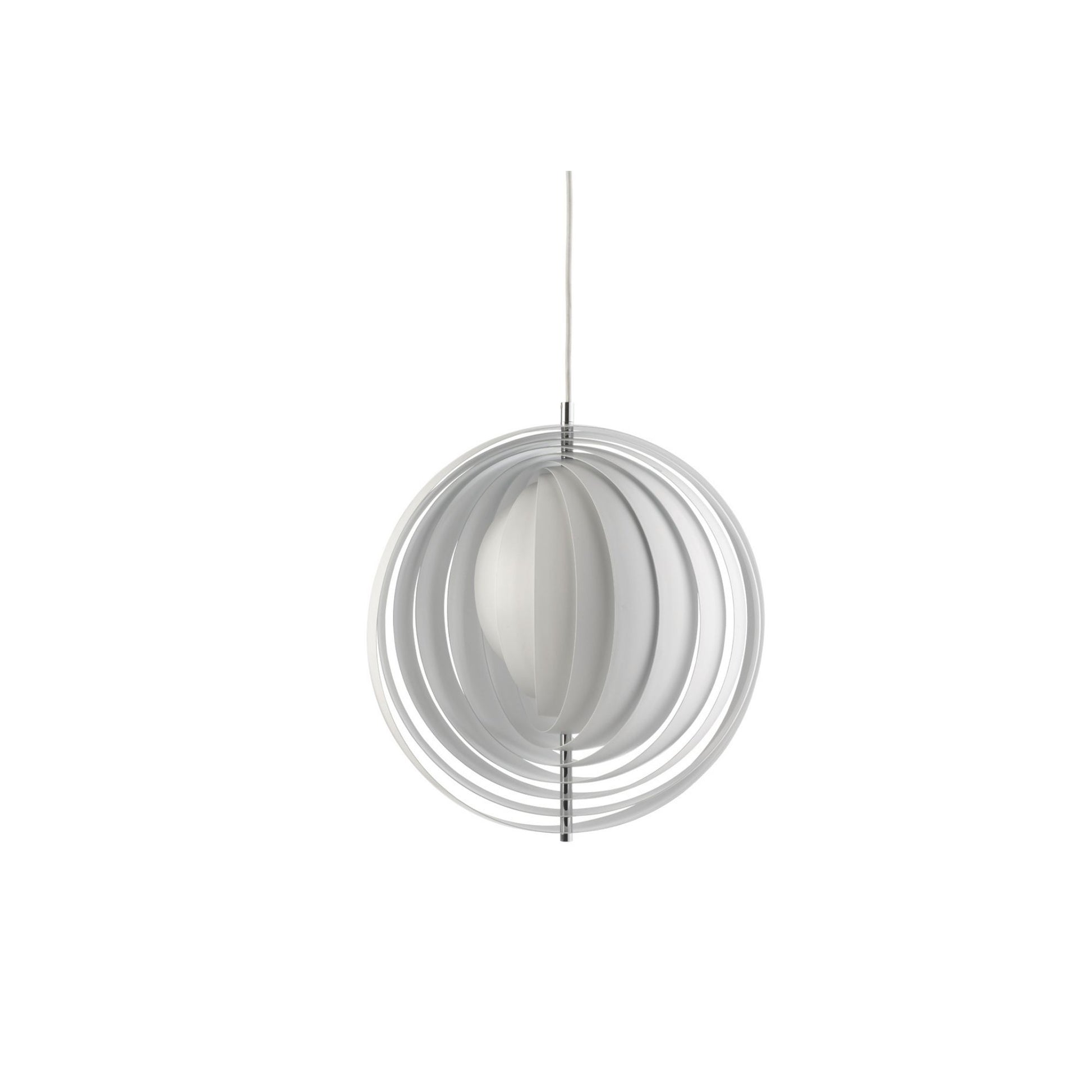 Designed in 1960, the Moon represents one of Verner Panton’s earliest designs in lighting. The iconic pendant is characterised by its fan-like design with ten ring-shaped lamellae perfectly positioned to provide a soft, ambient and glare-free light. The blades reflect and filters the light and the pendant changes its appearance depending on the angle at which you view it.