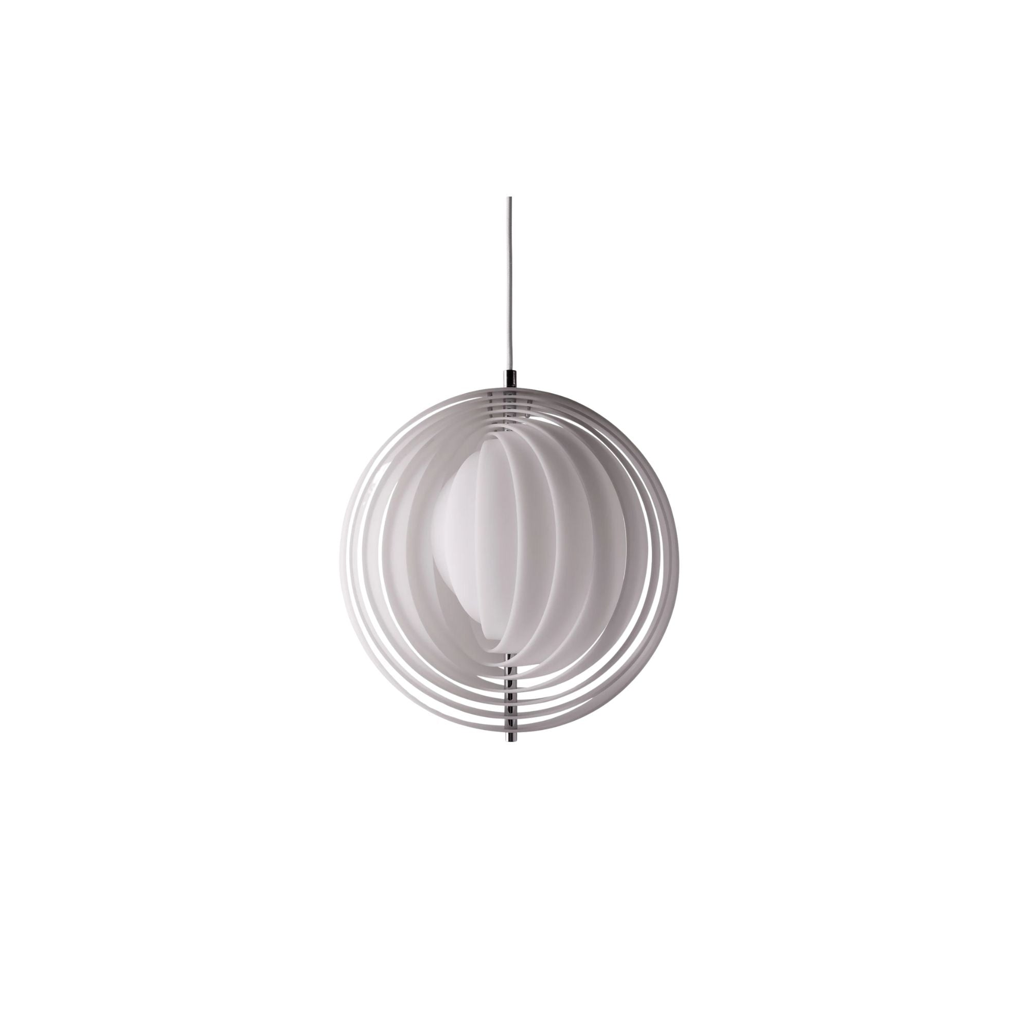 Designed in 1960, the Moon represents one of Verner Panton’s earliest designs in lighting. The iconic pendant is characterised by its fan-like design with ten ring-shaped lamellae perfectly positioned to provide a soft, ambient and glare-free light. The blades reflect and filters the light and the pendant changes its appearance depending on the angle at which you view it.