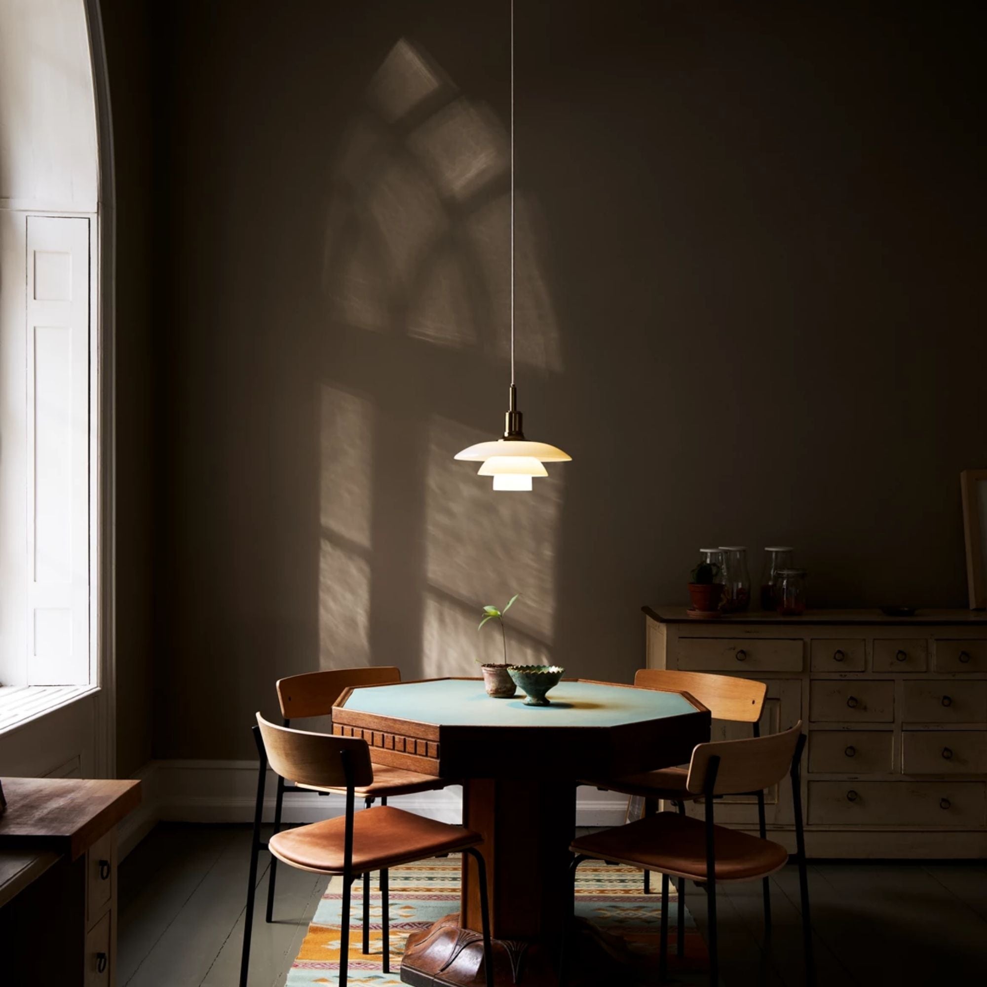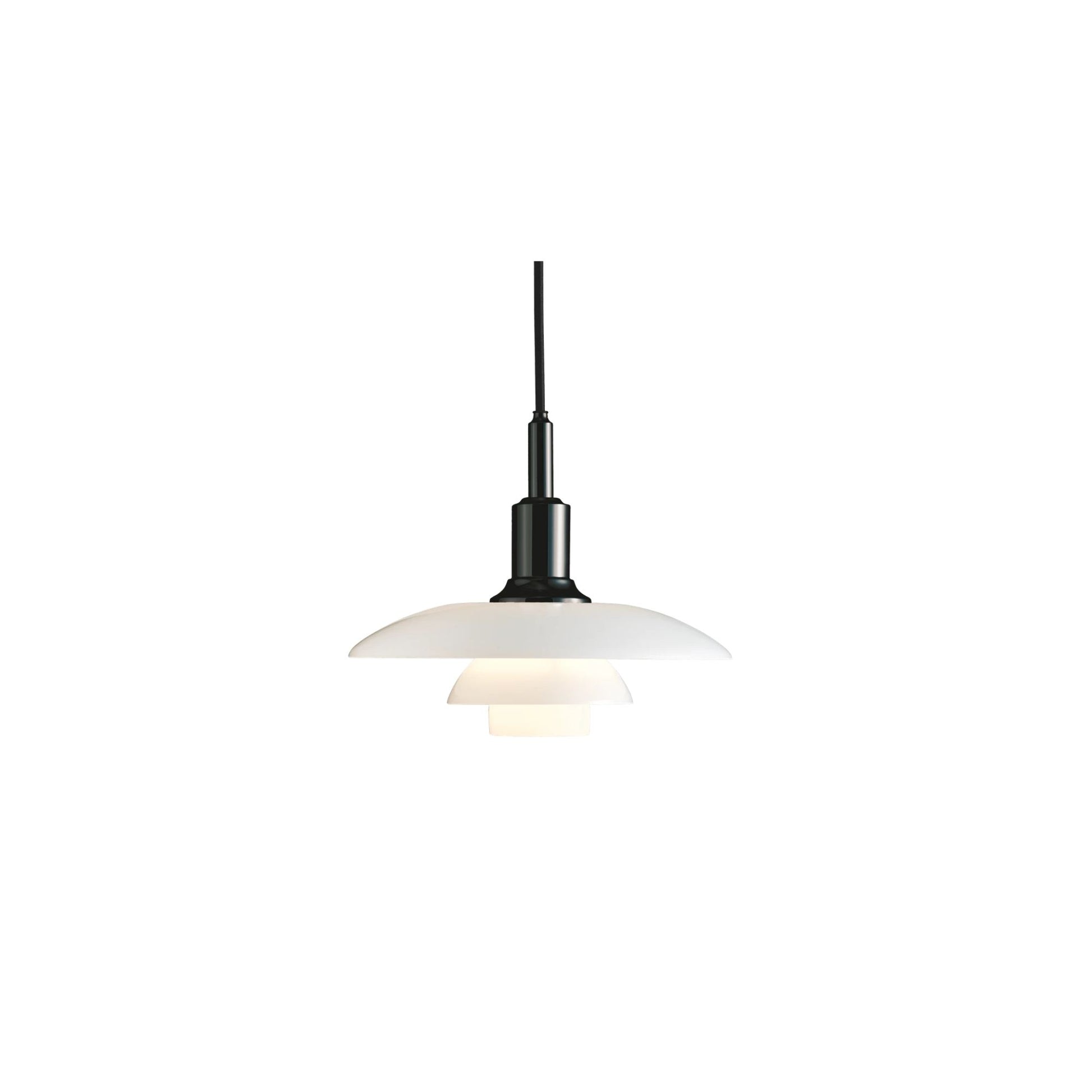 The PH 3/2 Pendant is a member of the three-shade family which numbers 30 lights today, including three for outdoor use. The pendant is designed based on the principle of a reflective three-shade system, which directs the majority of the light downwards. The shades are made of mouth-blown opal three-layer glass, which is glossy on top and sandblasted matt on the underside, giving a soft and uniform light distribution.