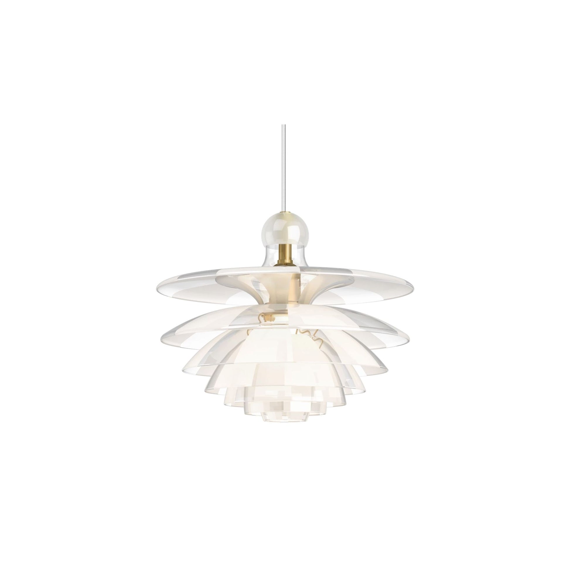 The PH Septima is regarded as one of Poul Henningsen’s most refined pendants. When exhibited for the first time as a prototype at the Danish Museum of Decorative Art (now Designmuseum Danmark) in 1928, the poetic piece was publically applauded. Based on the PH three-shade system, the glass crown has four extra shades inserted between the three basic shades - all seven produced in very delicate, but also strong, Italian borosilicate glass. The shades made of clear glass are treated to appear with alternate clear and frosted fields and are positioned so the frosted fields cover the clear fields underneath, allowing the shades to spread the light in a more diffused manner, while maintaining glare-free, downward directed light distribution.