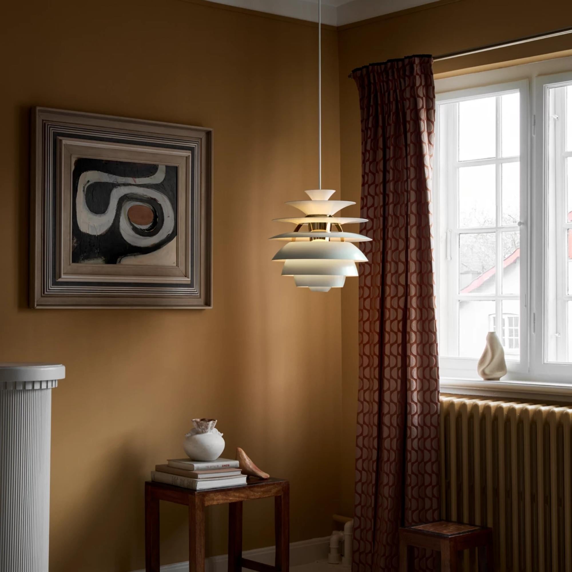 The PH Snowball pendant emits comfortable glare-free diffused light. Matt painted undersurfaces and glossy top surfaces result in an attractive reflection of the diffused light, creating uniform light distribution around the fixture. When the light is switched on, the top portion is illuminated while the bottom part remains dark.