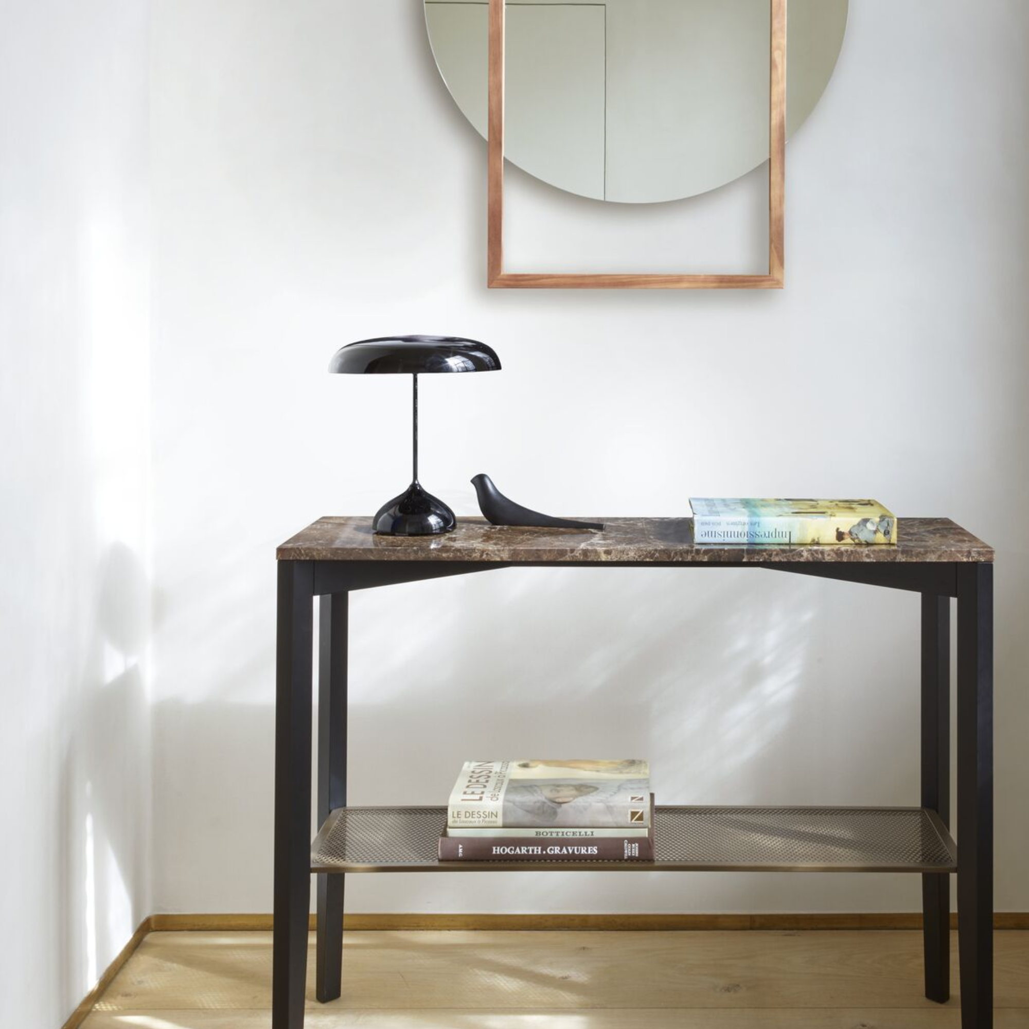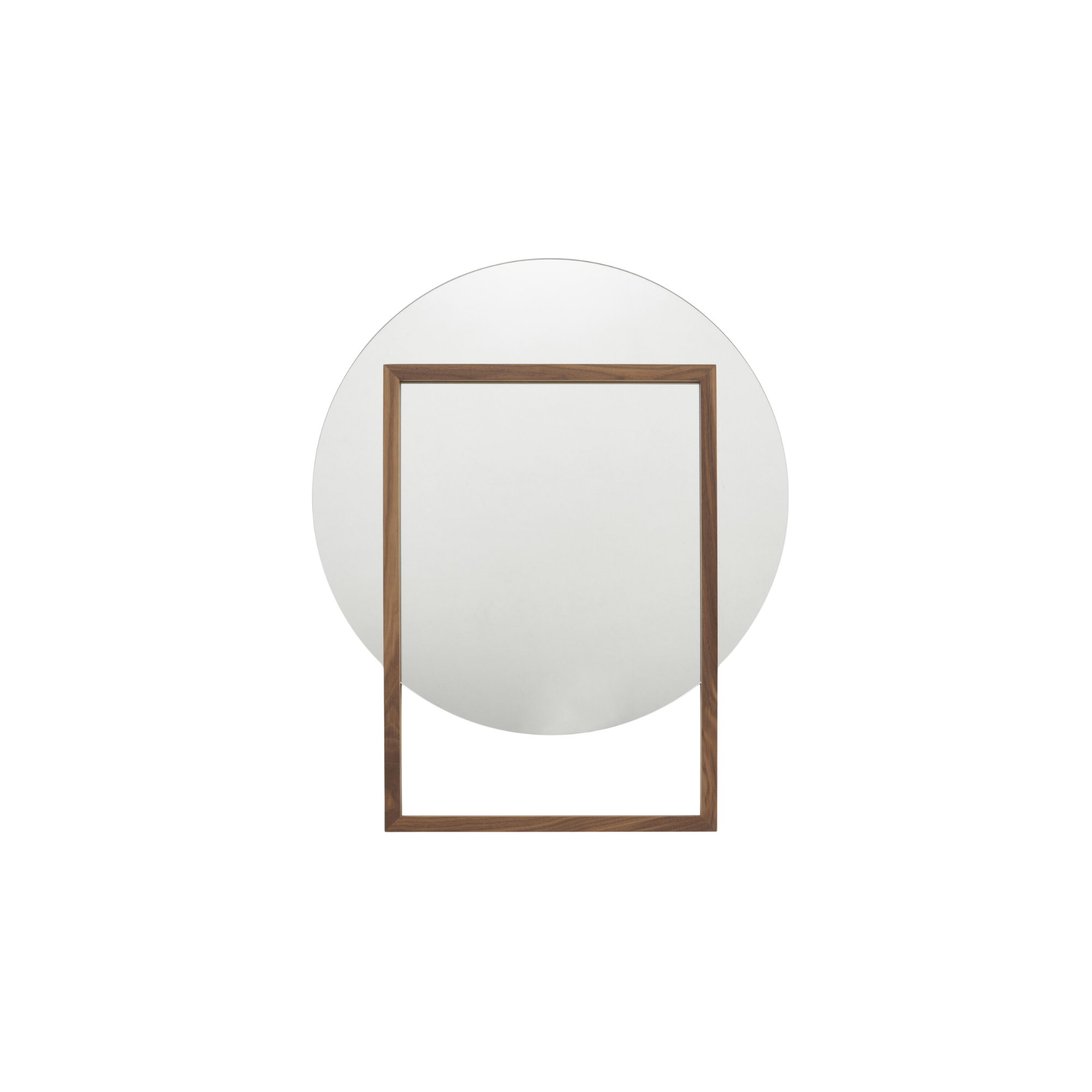 This mirror is composed of a frame in natural varnished solid American walnut, mirrored glass, and a wall fixing batten. It may also be set on a piece of furniture (but nonetheless still fixed to the wall). May only be fixed vertically (with wooden frame overhanging downwards). 2 stoppers are supplied in the packaging: these are to be placed on the bottom of the frame by the customer, if the mirror is resting on a piece of furniture.