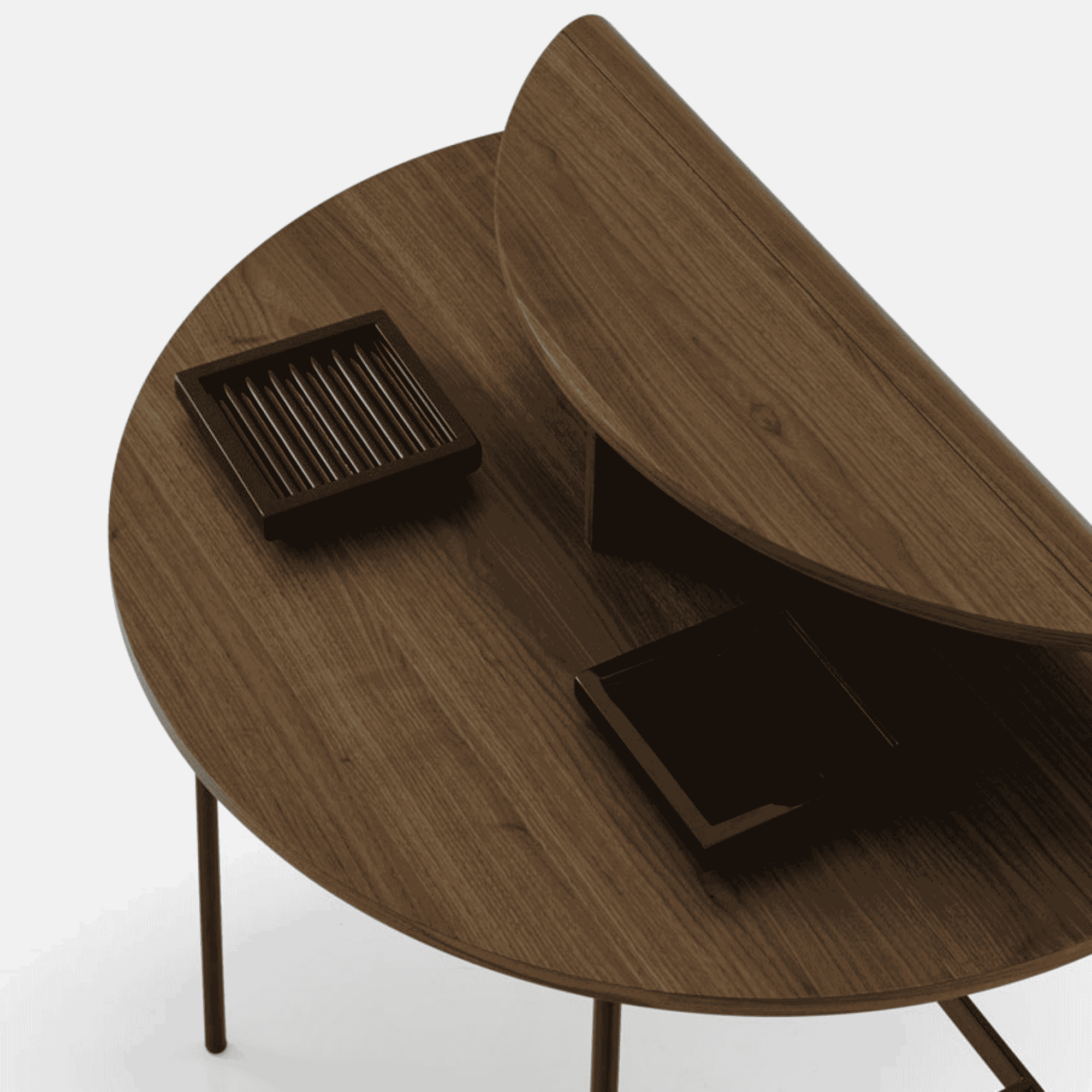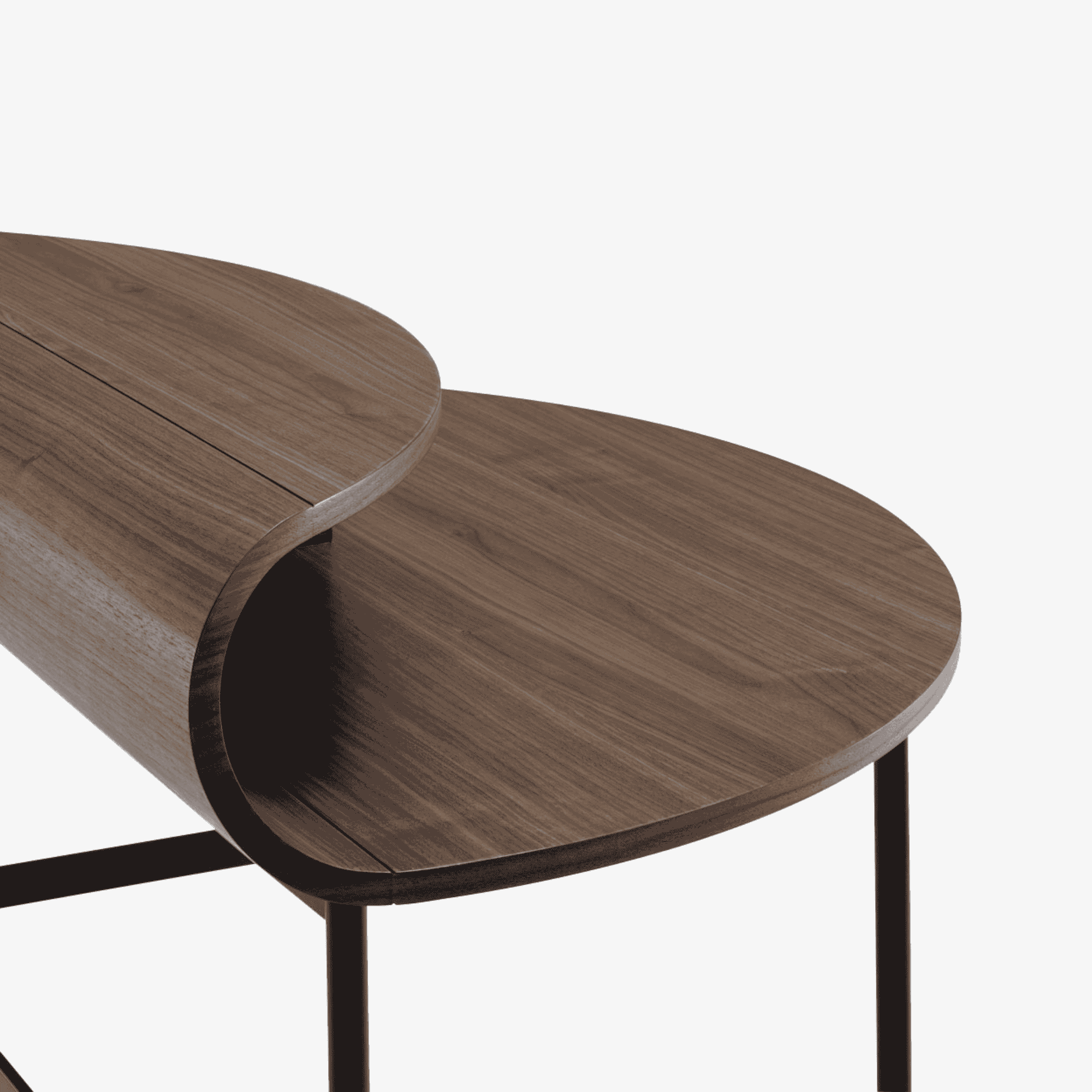 A small, compact, and feminine desk boasting both broad and fine strokes. Constructed from natural varnished walnut-veneered multi-ply, its base is in Epoxy satin black lacquered steel. A cable port at the rear allows passage for cables. It also may also be used as a hallway console.
