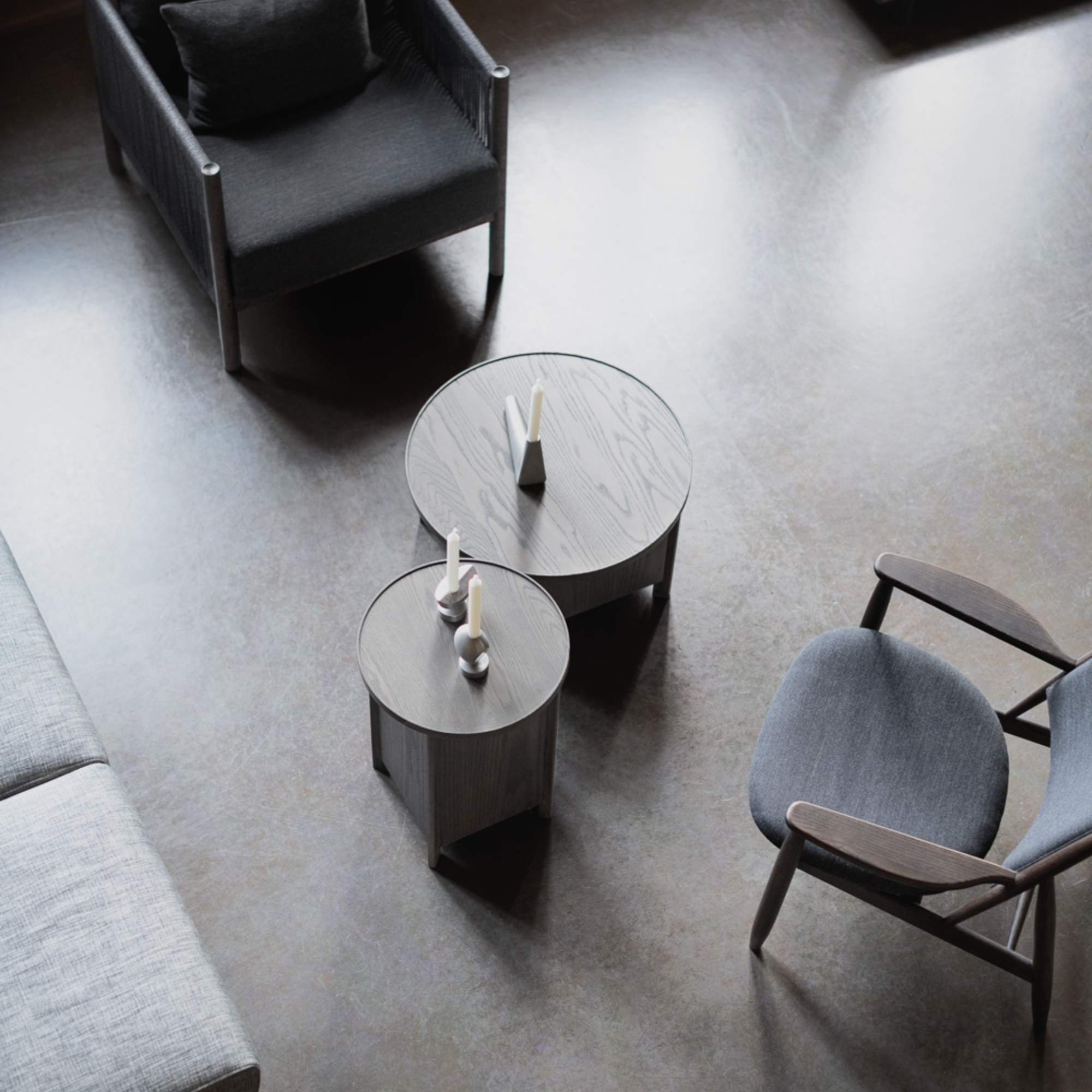 The Sake Table Collection, a pair of coffee and side tables, fulfils three functions — table, tray, and storage unit — making it both functionally versatile and visually striking. A fusion of Scandinavian and Japanese design approaches, the table comprises two distinct shapes: a rectangular box that serves as storage, edged by battens that form the legs and lift it just above the ground, conveying a sense of lightness and grace. On top, a circular tray with a delicate raised edge can be removed to provide access to the storage area beneath.