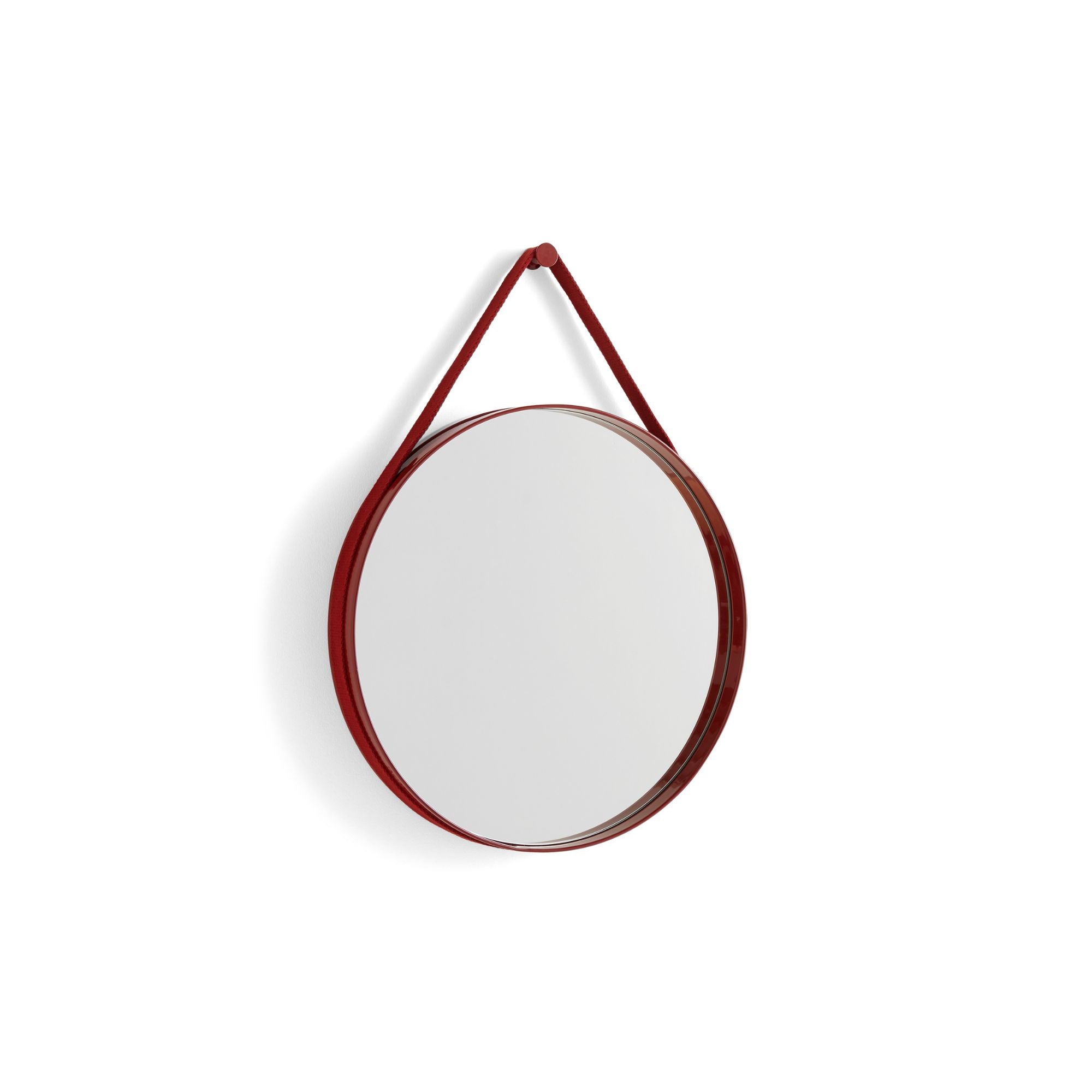 With a functional and minimalistic design, Strap Mirror features a subtle groove around the edge that contains a woven strap for mounting the mirror on the wall. Made in powder-coated steel with a high gloss finish in a variety of colours, Strap Mirror’s clean circular design makes it ideal for hanging in bathrooms, bedrooms, and entrance halls.