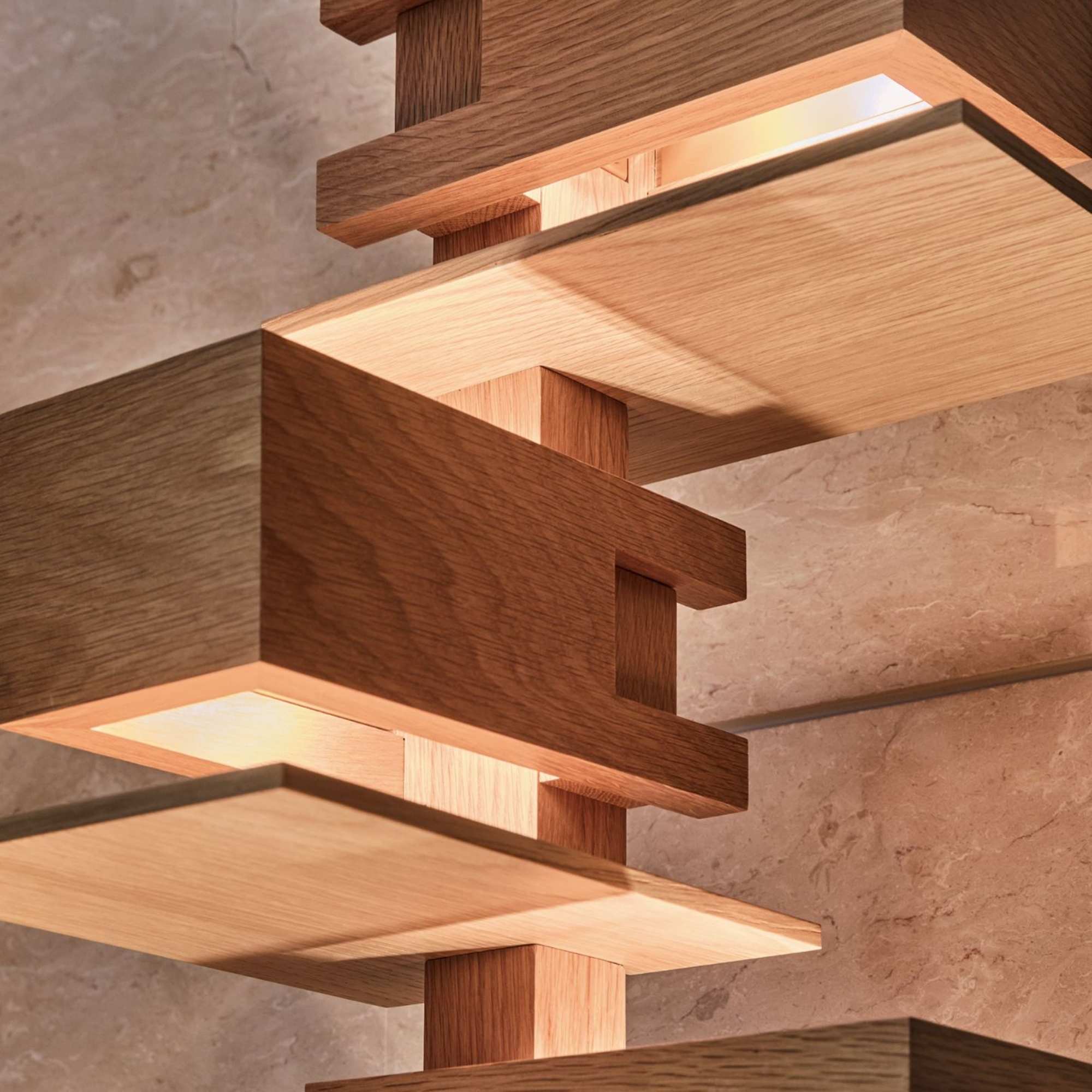 Inspired by the natural effects of light in nature, he believed the sun and moonlight that filters through leaves and branches to be beautiful. They are composed of a series of illuminated rectangular, solid wood boxes that act like branches and leaves to provide an organic sculptural composition to this floor lamp. The boxes provide soft, patterned, indirect illumination while concealing the light sources and reducing glare. These fixtures function as complimentary interior decor both during the day and at night.