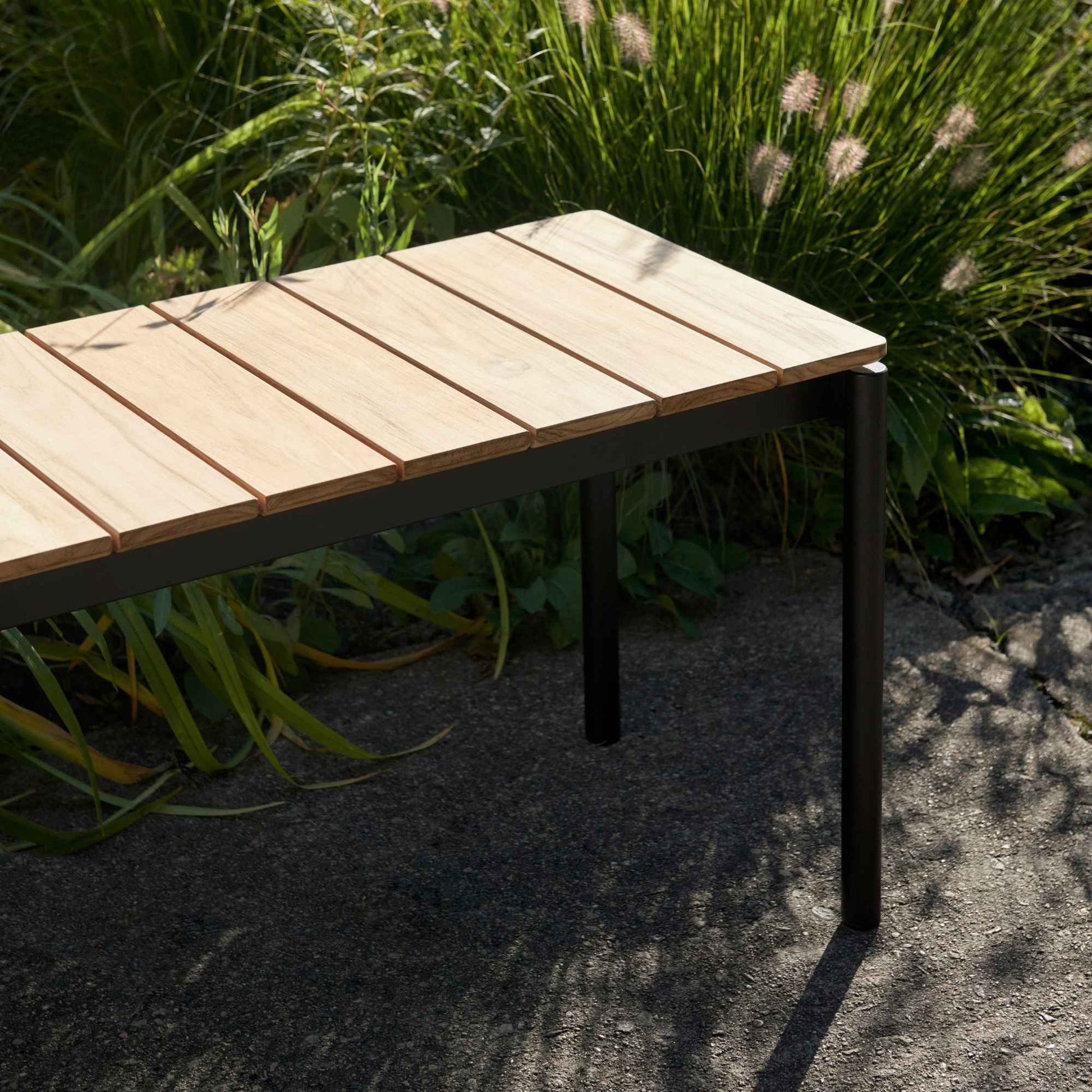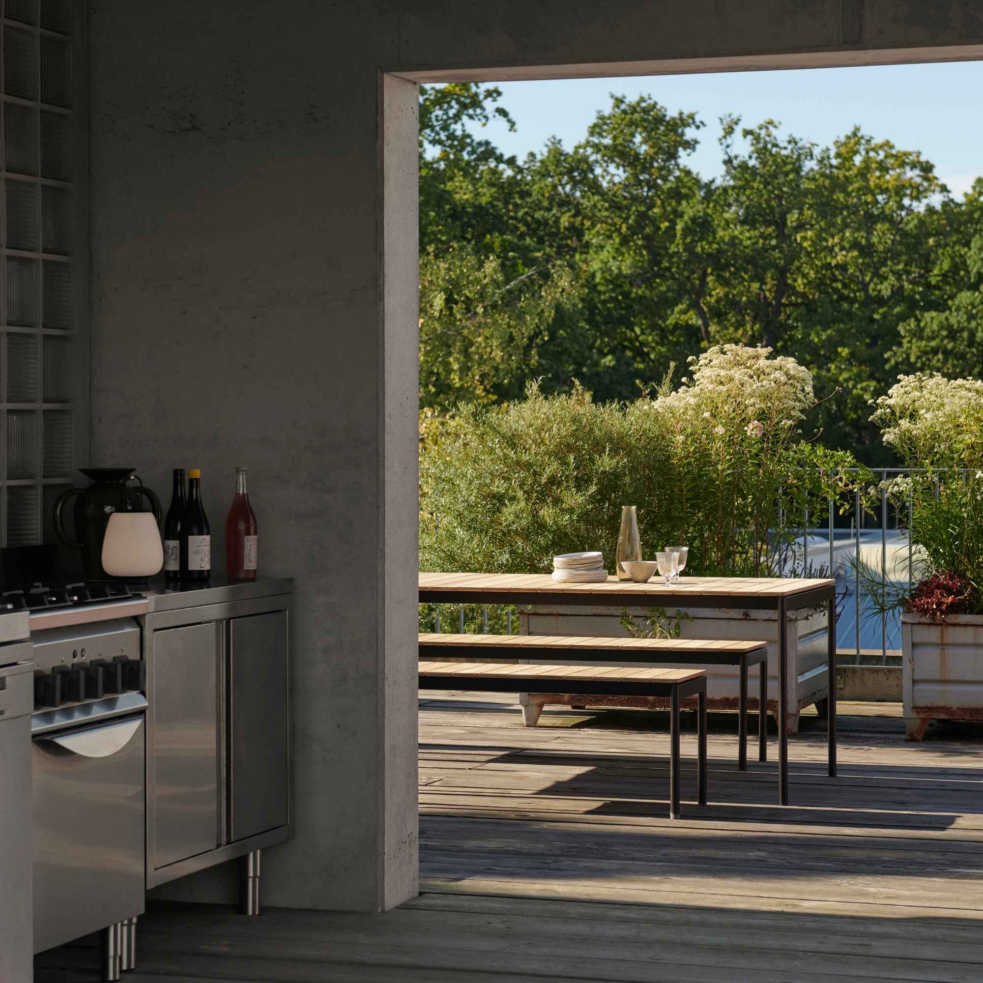 Crafted from solid teak and powder coated steel, &Tradition's Ville AV28 Bench by Anderssen & Voll embodies relaxed outdoor living. Its compact size makes it ideal for terraces, patios, or cosy dining setups, whether paired with the AV25 Table or used on its own.