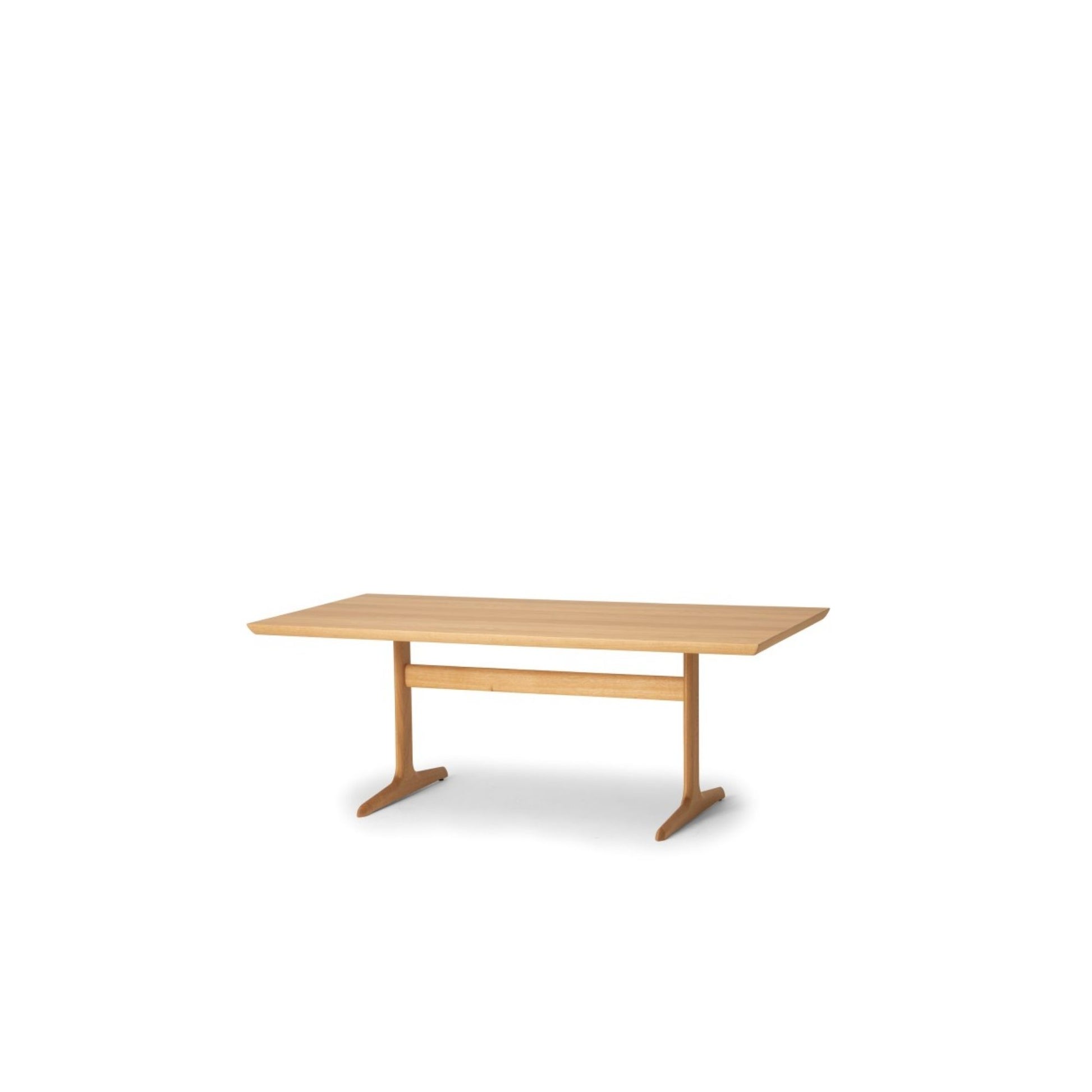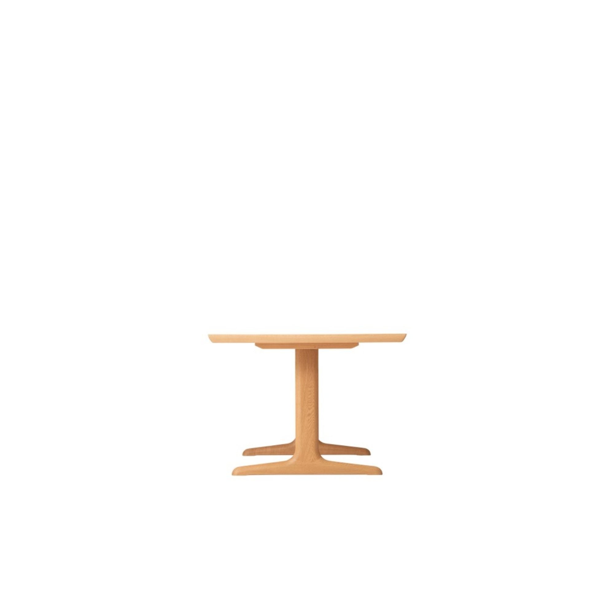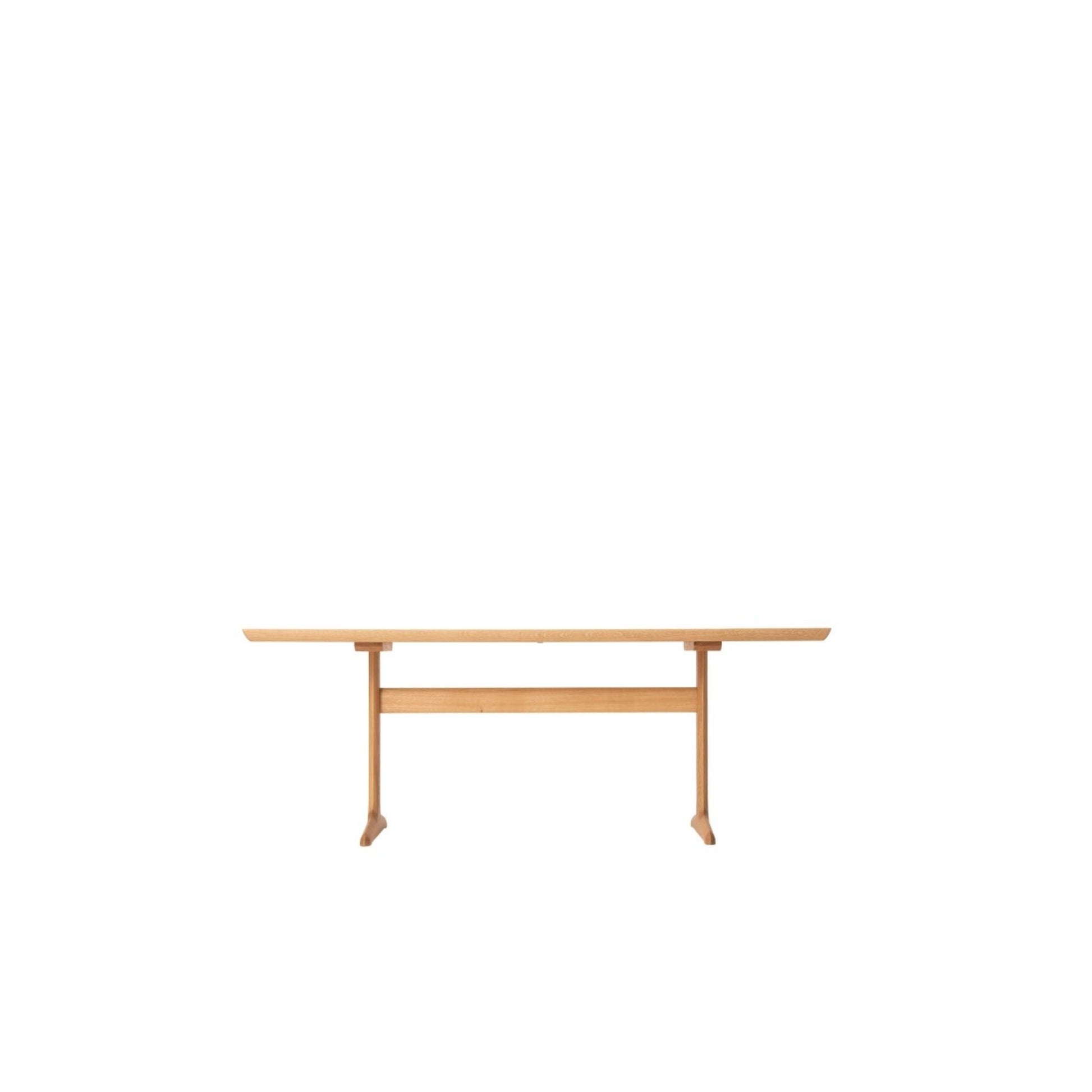 This table was developed especially to be coupled with benches, so that the table legs don't lie in the way. It may look like an ordinary T-leg table, but a close look reveals unique features. The legs are shaped edgy like a sword; and the metal joints between the legs and beam can't be seen. The 40 mm thick top board is veneered at random.