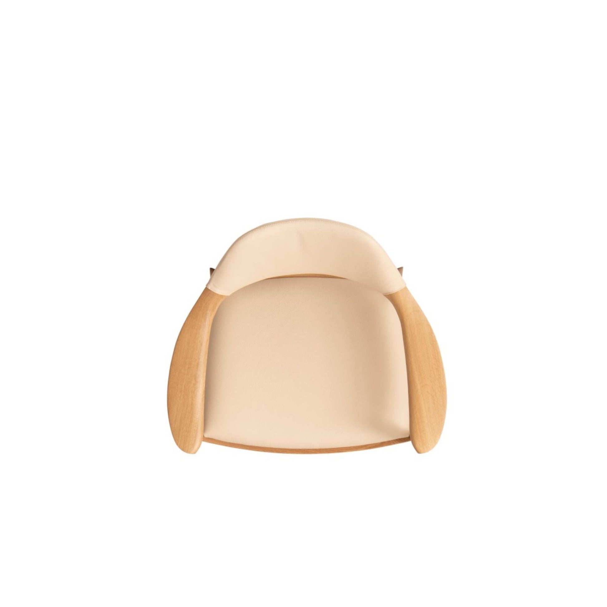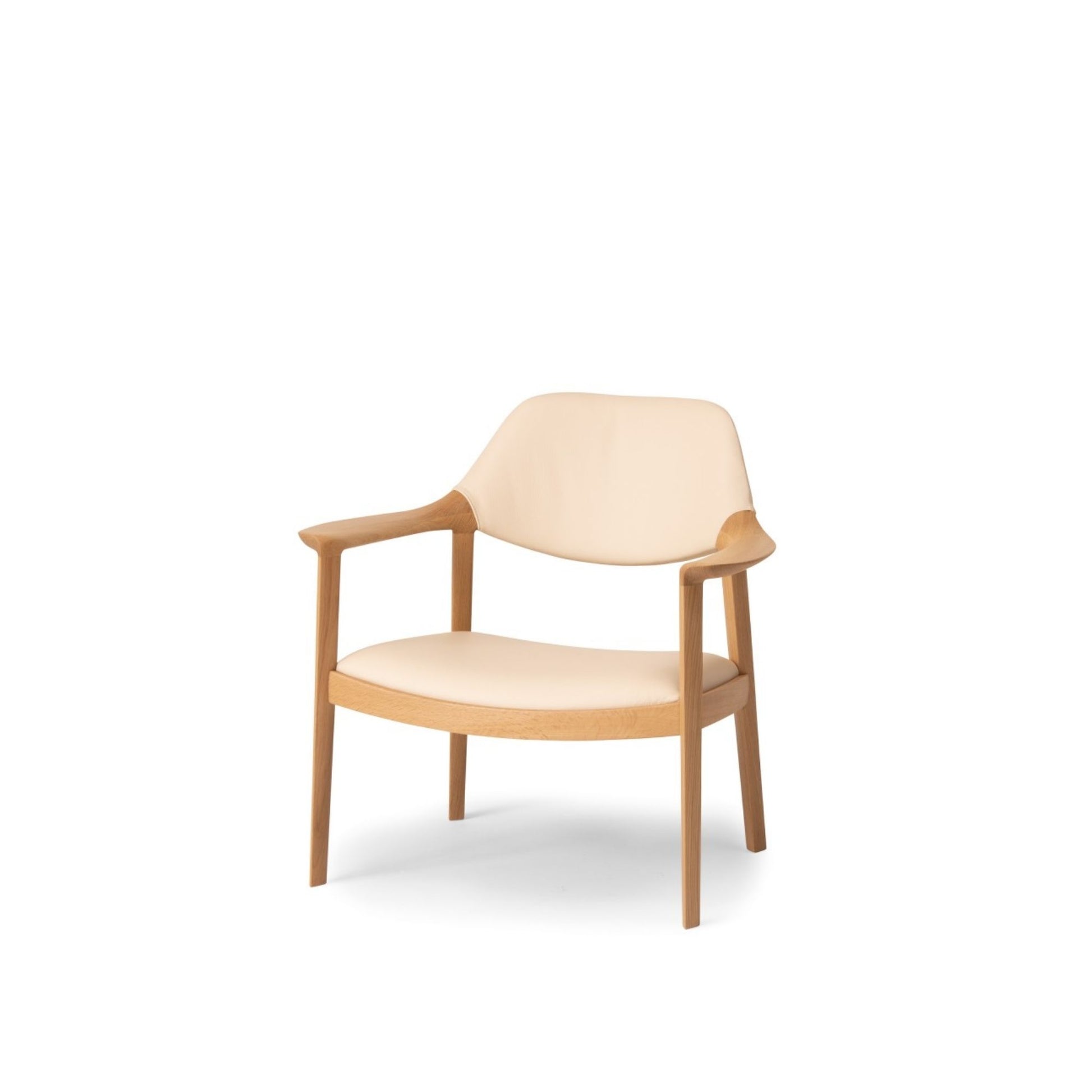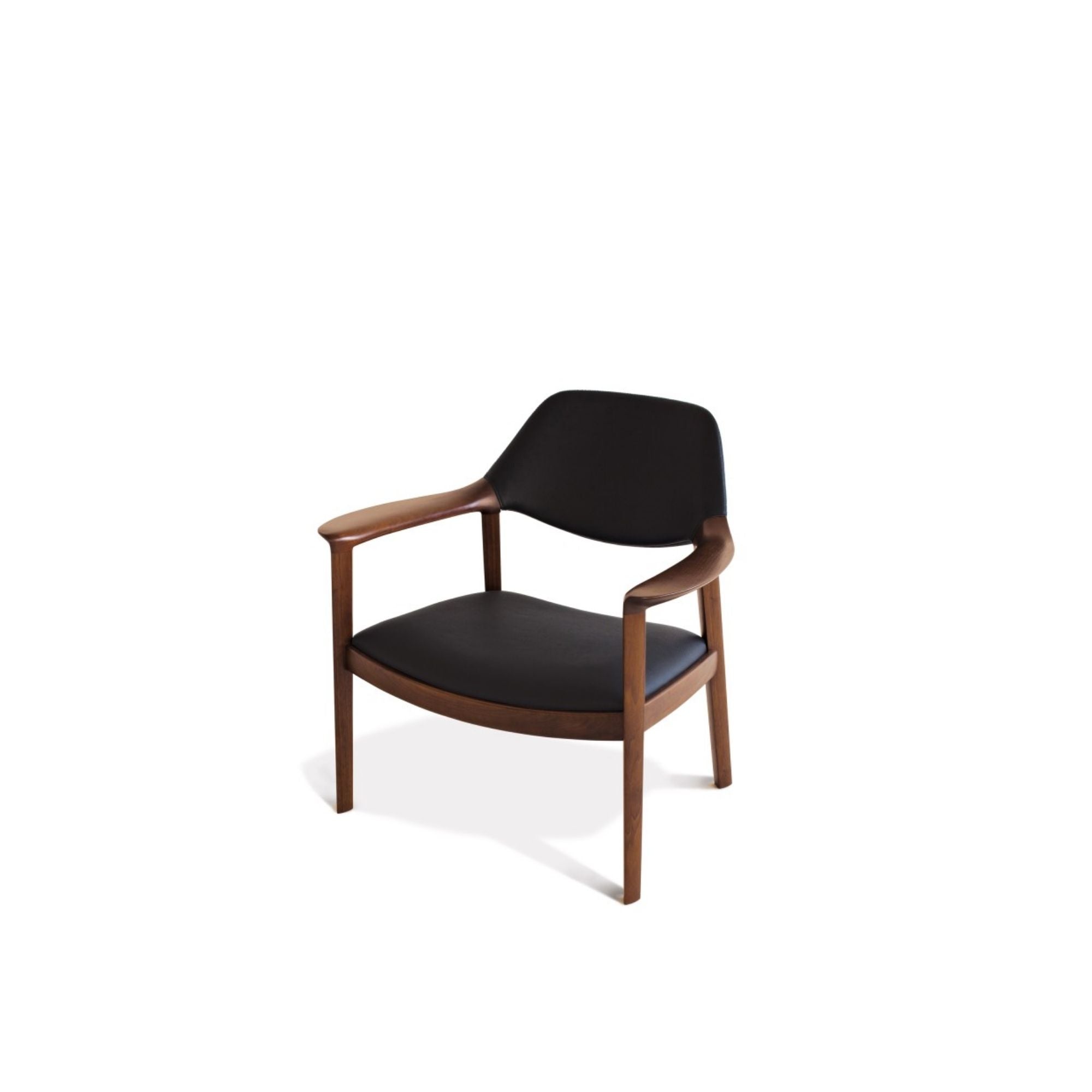 This is the iconic item of Wing collection. The design motif of this chair is a bird spreading its wings out, from which the name of the collection Wing comes. Our forming technique realises the massive backrest with the minimum amount of wood. The edges of respective parts are sharp in contrast to the flowing silhouette. A covering seat seat is adopted so that customers can replace seat upholstery easily.