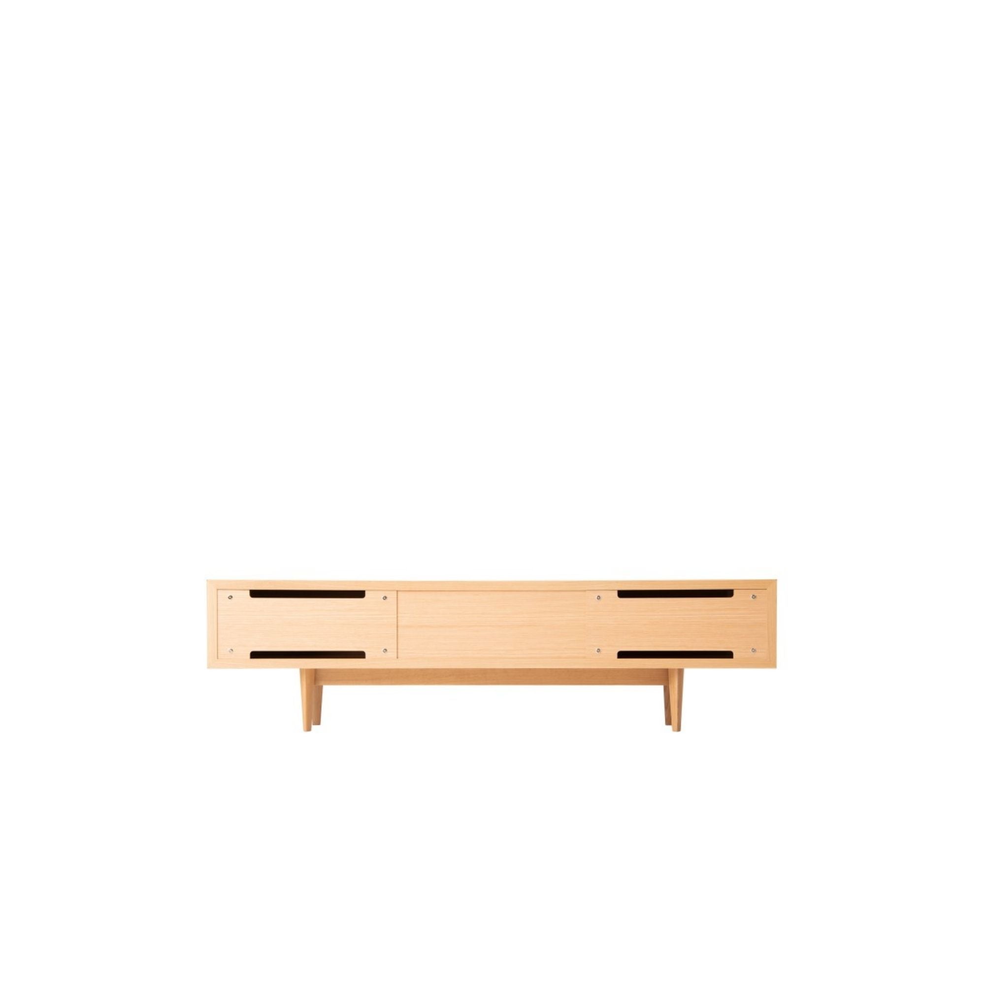 A simple lowboard that can be used flexibly in many ways. It has a drawer in the middle and flap-door compartments on both sides. Our craftsmanship can be seen on the front face where wood grain runs horizontally from one end to another. The back panel is removable for wiring.