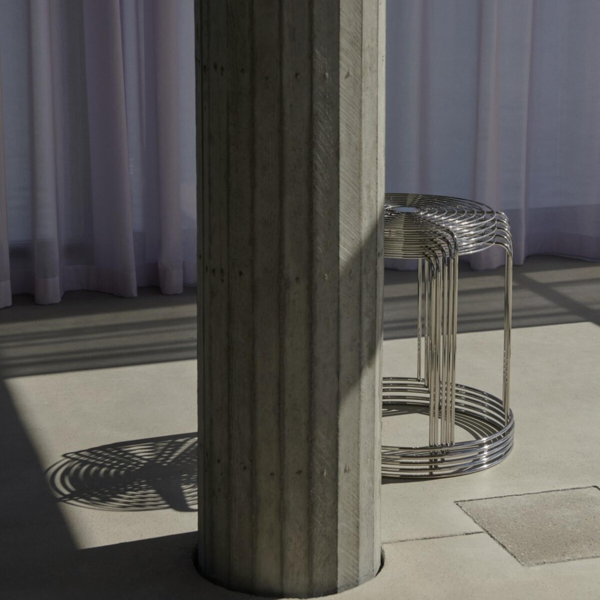 The Wire Stool by Verner Panton embodies his signature geometric aesthetic in a sculptural stainless-steel wire form. Lightweight and stackable, it serves as both a stool and side table. Available with optional magnetic seat pads in four colours or a sleek marble top, it’s a versatile addition to any modern space.